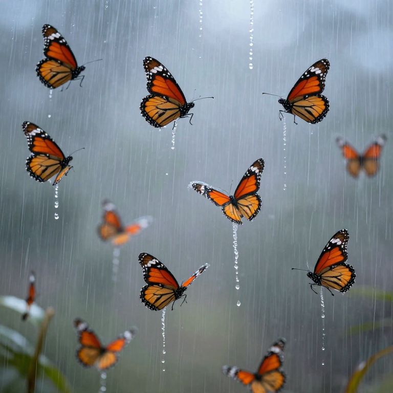Monarch butterflies hover serenely amidst a cascade of frozen raindrops, their vibrant wings defying gravity as they perch delicately on icicles in a dreamlike, ethereal realm.