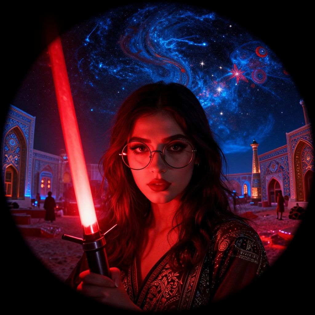 Photograph of a young woman with wavy dark hair and large, round glasses, holding a glowing red lightsaber in front of her chest. She wears a black, intricately patterned top. The background features a nighttime scene of a historic, star-lit courtyard with illuminated, ornate domes and arches. The sky above is a vivid, swirling mix of blue and purple stars, adding a cosmic feel. The image is framed in a circular black border, enhancing the focus on the woman and her lightsaber. The overall composition blends sci-fi elements with historical architecture.