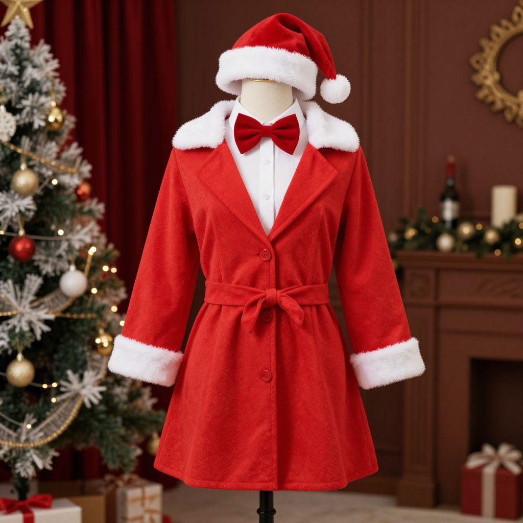 Outfit Christmas Party Costume, dressed in a red coat and hat with a red bow tie