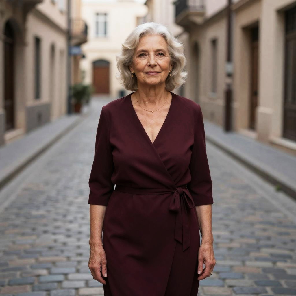 Vintage actress wearing a rose gold wrap dress, standing in a rooftop garden at twilight