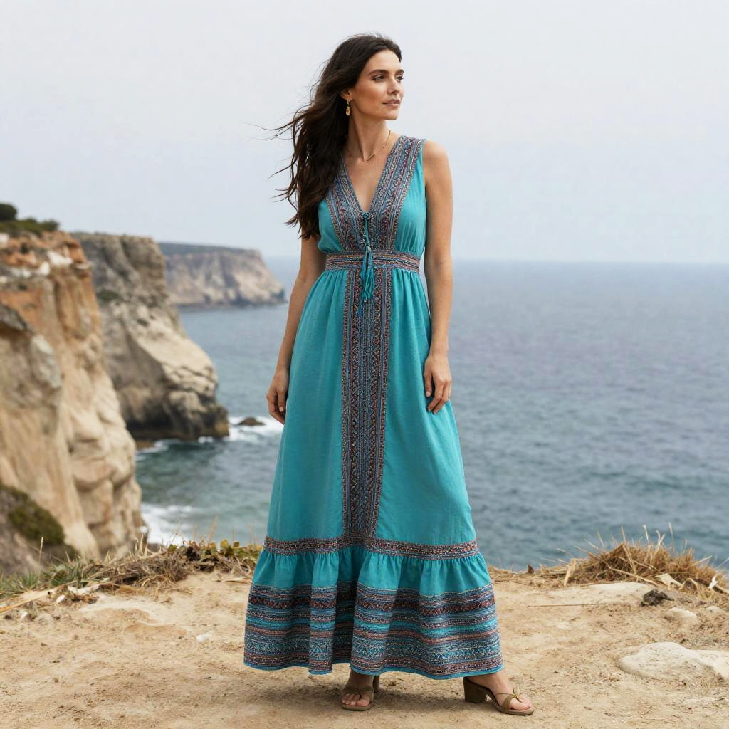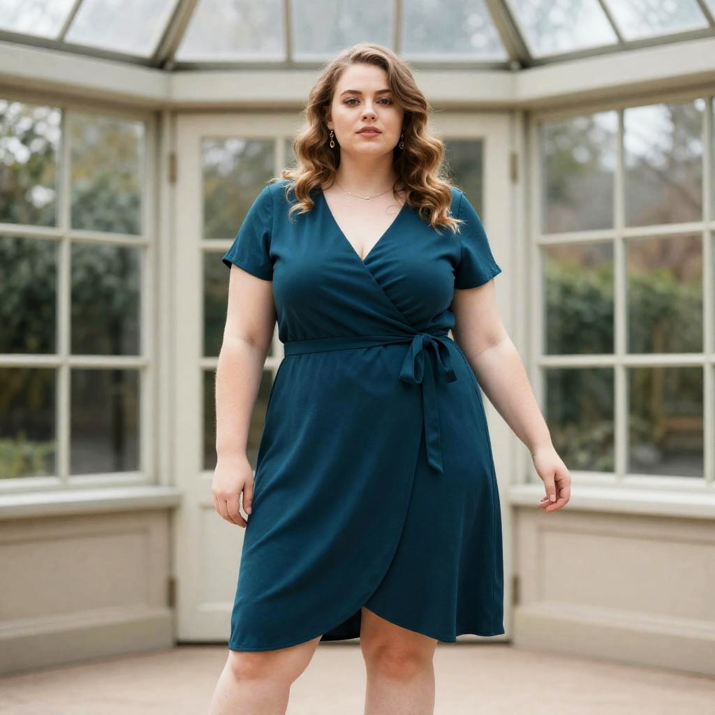 Woman in Rose Gold Wrap Dress on Rooftop Garden