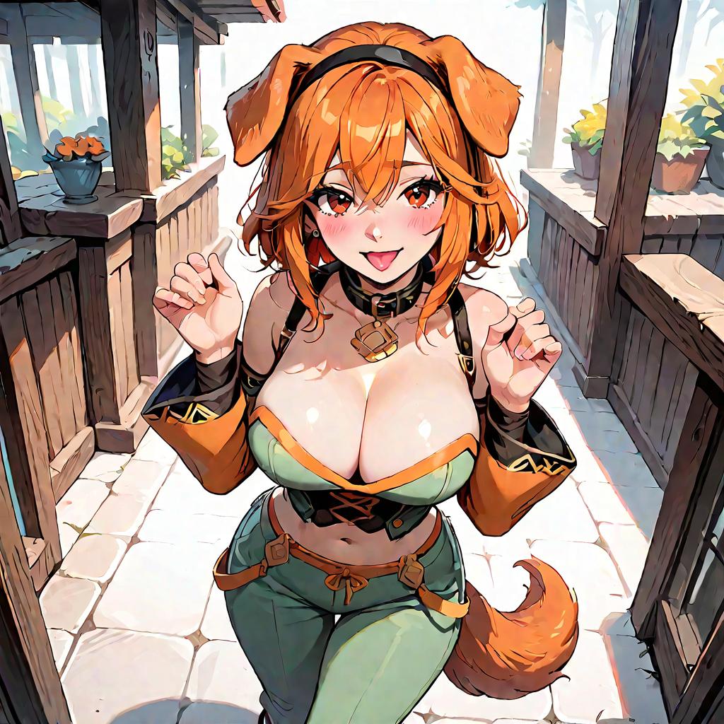 Masterpiece, best quality, highly detailed, score_9, score_8_up, score_7_up, score_6_up, source_Anime, 1girl, breasts, dog ears, fantasy, solo, floppy ears, collar, animal ears, dog girl, green pants, tail, black collar, large breasts, navel, cleavage, dog tail, orange fur, orange hair, black hairband, open mouth, sandals, looking at viewer, brown eyes, bare shoulders, smile, hairband, hands up, blush, pants, hair between eyes, standing, detached sleeves, stomach, medium hair, bangs