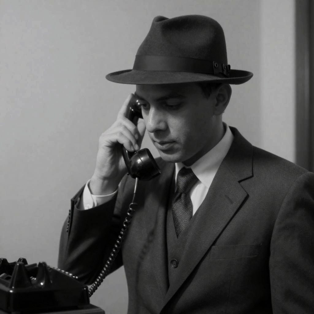 Black and white photograph of a man in a suit and fedora, holding an old-fashioned rotary phone to his ear. His expression is focused. The phone is on a dark stand. Background is a plain wall.