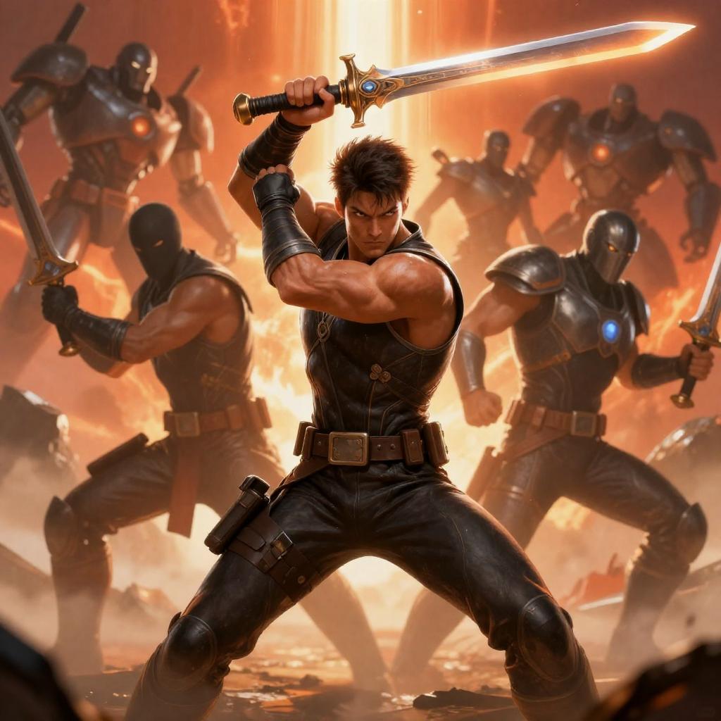 Dynamic sci-fi battle illustration. Central figure, muscular man with dark hair, armored, wielding glowing sword, intense expression. Surrounding him, five warriors with varied armors and weapons. Red-orange sky, blazing light source behind. Robots and explosions in background. Hero's pose dominant, sword raised. Intense, chaotic atmosphere.
