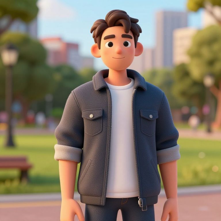 3D cartoon boy with short black hair, blue denim jacket, white shirt, and dark pants stands in a sunny park.