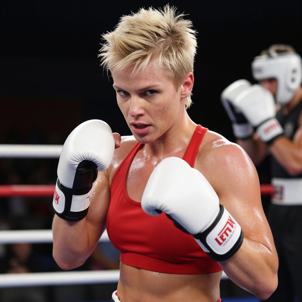 Photograph of a muscular, blonde, fair-skinned woman with short, spiky hair, wearing a red sports bra and white boxing gloves with black and red accents. She is in a boxing ring, mid-punch with a focused expression. Her skin is glistening with sweat. In the blurred background, another person in white boxing gear is visible. The ring has red and white ropes, and the lighting highlights her toned muscles and determined look. The image has a high-contrast, vibrant style.