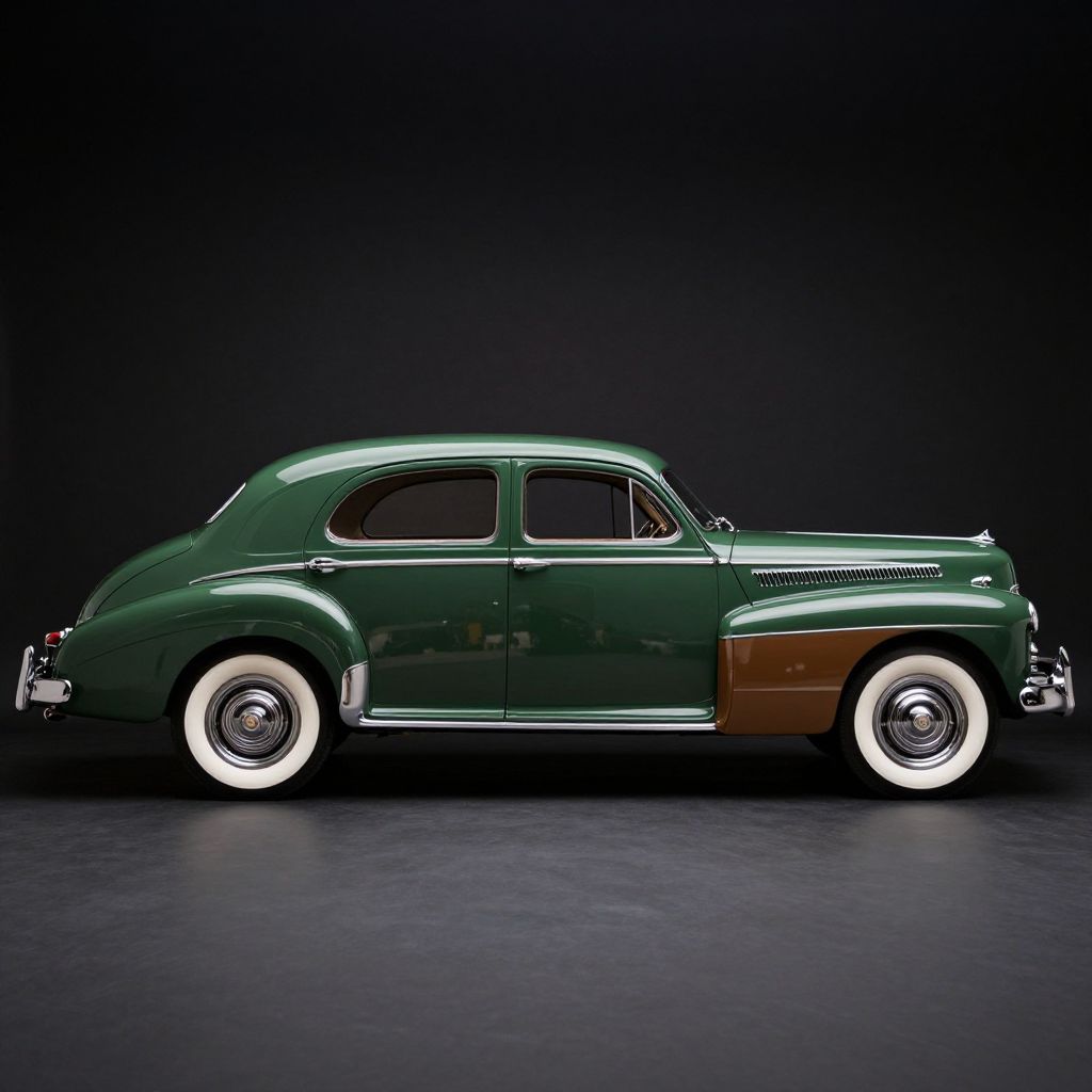 Photograph of a vintage green sedan car, viewed in profile, against a dark, gradient background. The car features classic 1930s styling with rounded edges, chrome accents, and white-walled tires. The body is a rich, glossy green with a contrasting brown panel on the lower side. The car's windows are darkly tinted, and the headlights are chrome. The background is completely black, highlighting the car's elegant and nostalgic design. The car's smooth, polished surface reflects light, adding to its vintage charm.