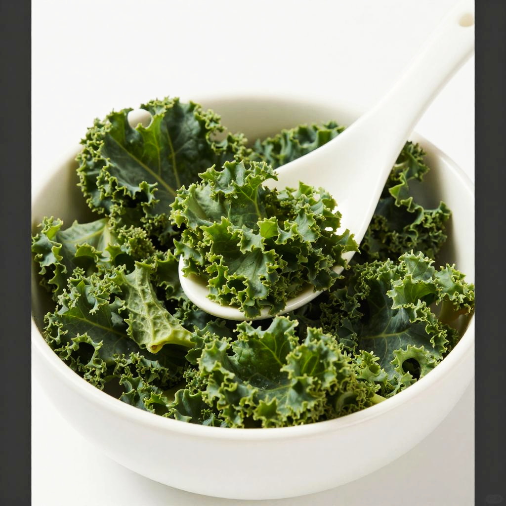 A close-up photo of a white ceramic bowl filled with bright green chopped kale. A white spoon is partially submerged in the kale. The background is plain white, with a dark gray border on the left and right edges of the image. The kale looks fresh and slightly textured. The overall look is clean and simple.