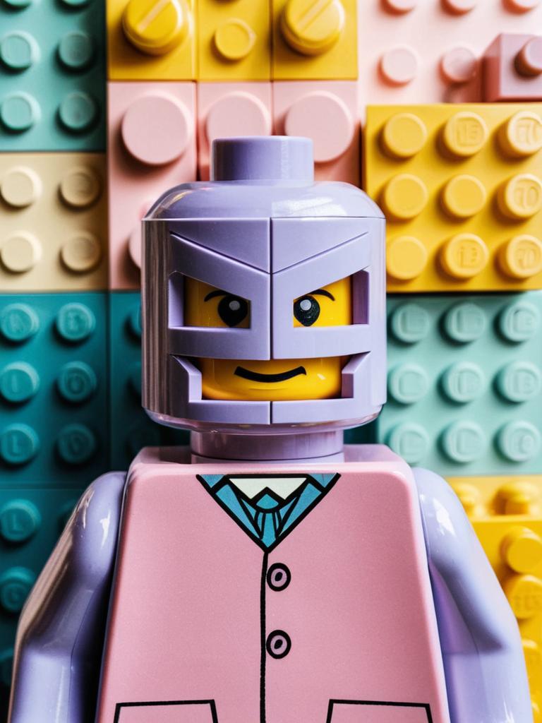 Man in Lego Pastel Building Blocks costume, cosplay studio portrait, realistic detail