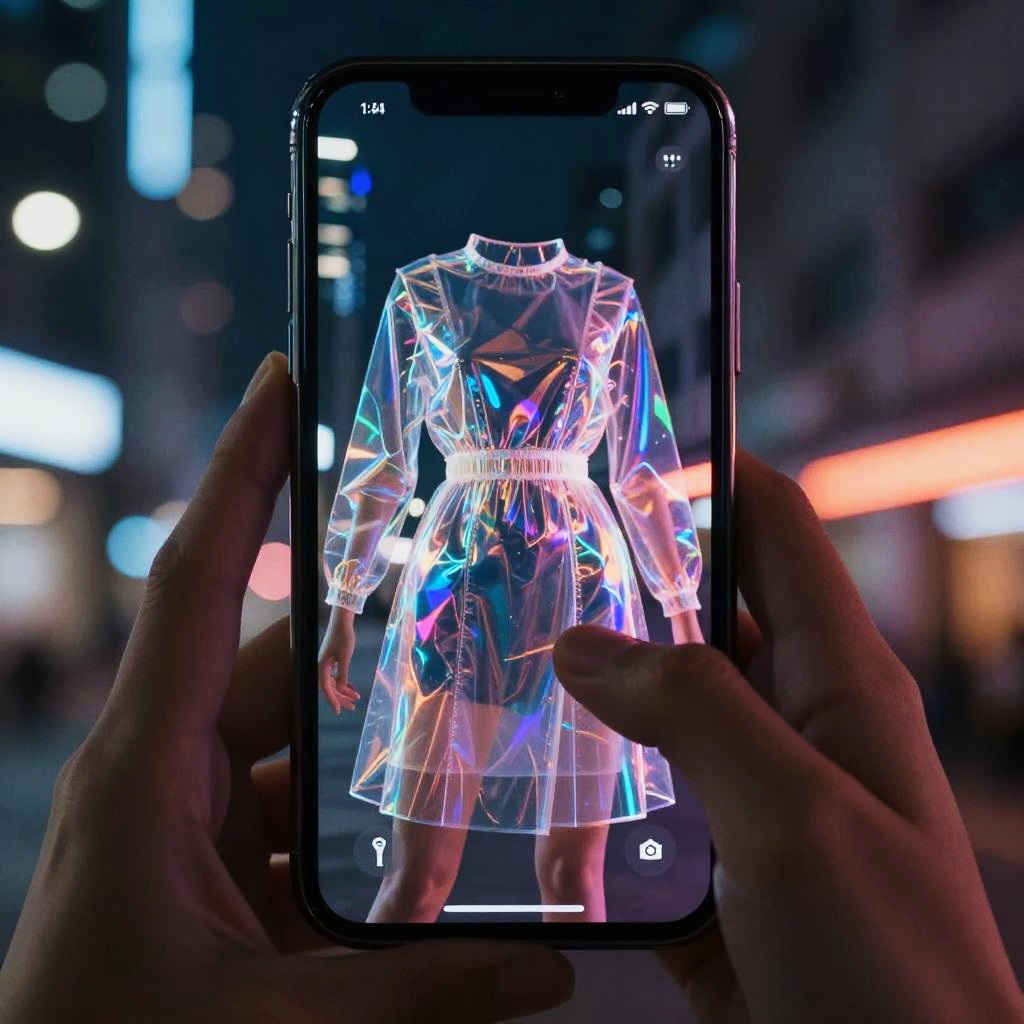 See through clothes filter online, surreal digital artwork featuring a person interacting with a transparent dress filter on a smartphone screen, ambient light reflecting off holographic clothing, modern cityscape in the backdrop, neon hues and futuristic vibes