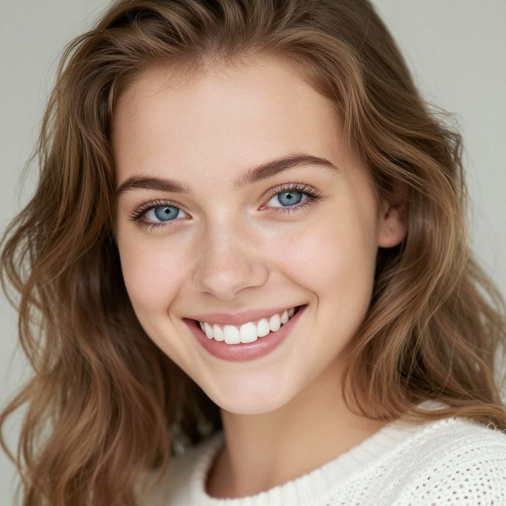 This is a close-up, color photograph of a smiling young woman with light brown, wavy hair and blue eyes. She has a warm, radiant smile showing her white teeth and is wearing a white, textured sweater. The background is softly blurred, focusing attention on her face. Her skin is fair, and she has well-groomed eyebrows. The overall image has a bright, cheerful vibe.