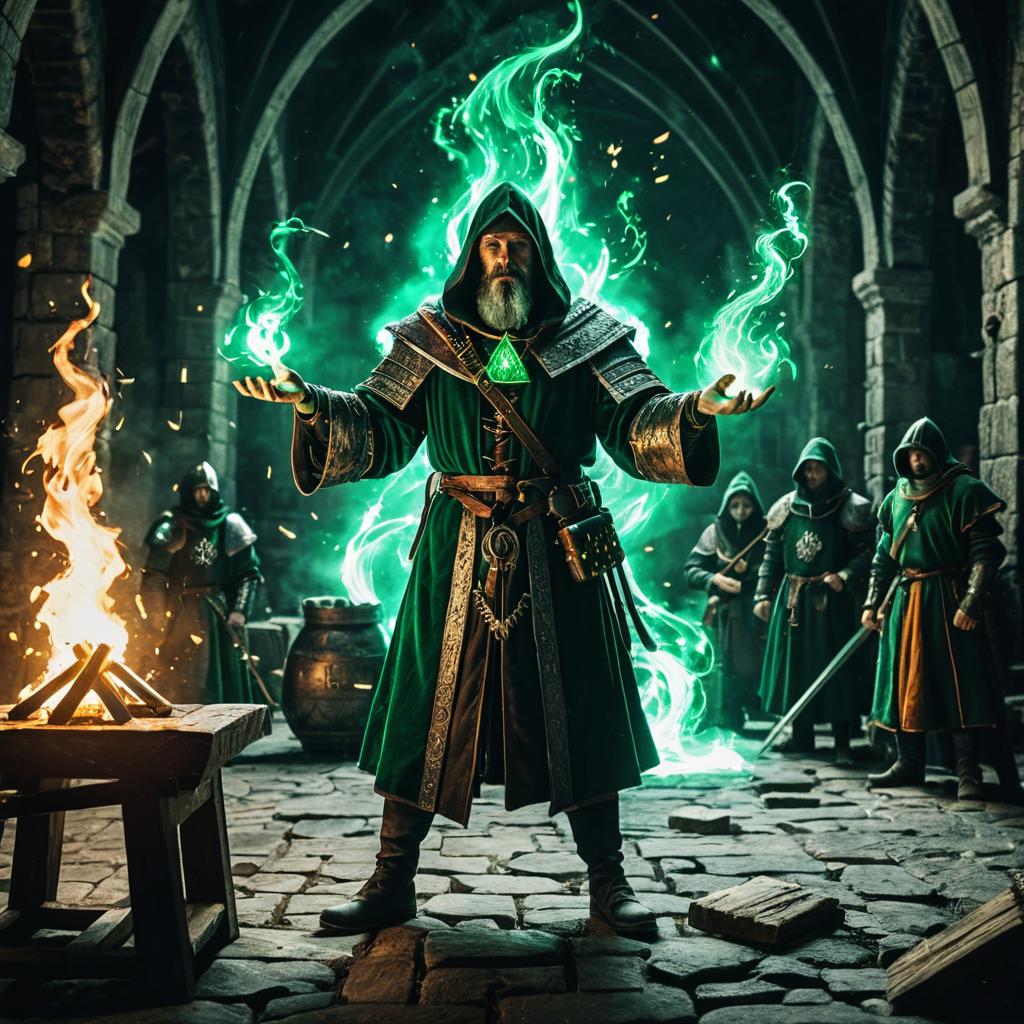An arcane alchemist draped in rune-etched cloak, radiating an intoxicating aura amidst a backdrop filled with alchemy lab filled with potions and bronze gears and steam.