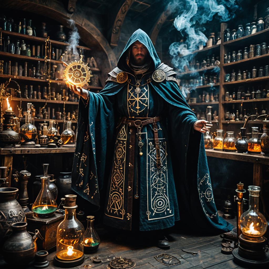 A male arcane alchemist standing in an ancient alchemy laboratory surrounded by shelves filled with various potion bottles and bronze artifacts. He is wearing a dark blue cloak adorned with mystical golden runes and symbols, holding a glowing, steam-emitting brass gear in one hand. The scene is dimly lit, emphasizing the mysterious and magical atmosphere of the alchemist’s workspace.