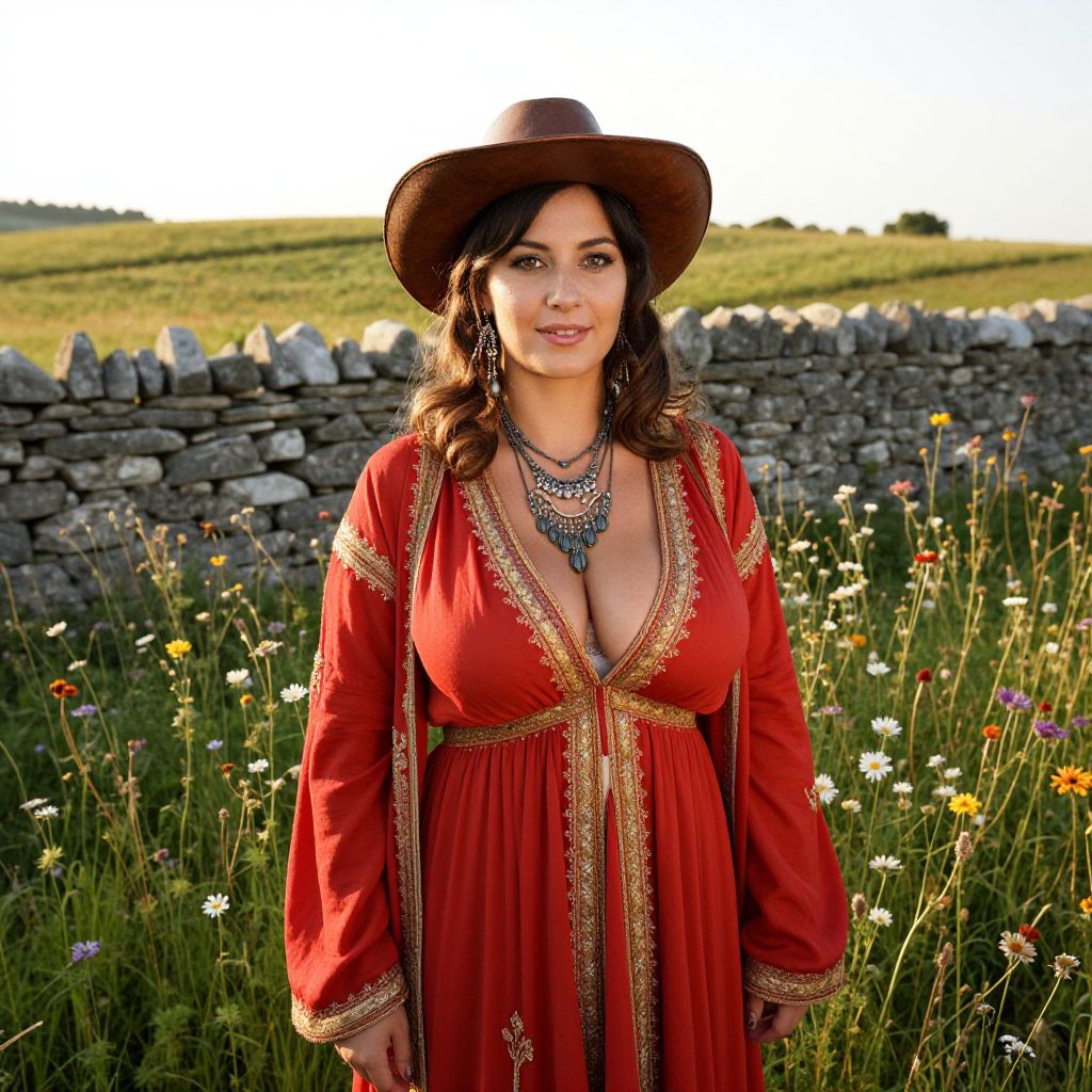 A realistic photographic portrait of a gypsy woman in a vintage gypsy woman costume, wearing a flowing red and gold embroidered dress, a wide-brimmed leather hat, and ornate jewelry, standing in a sunlit field surrounded by wildflowers and a stone wall in a rural European countryside, with soft golden hour lighting and natural shadows, face with warm, expressive eyes and a gentle smile, detailed textures of the costume evident. The woman has big tits and cute face