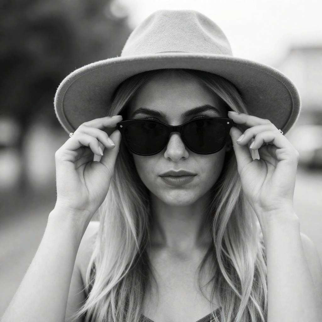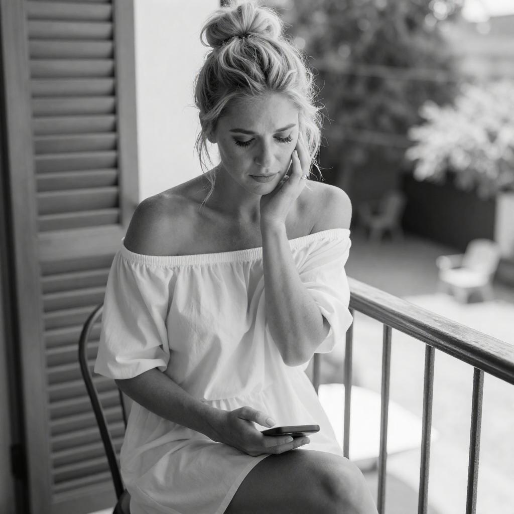 Black-and-white photograph of a blonde woman with an updo hairstyle, sitting on a balcony railing. She wears an off-shoulder, loose dress, looking down with a slightly sad expression. Her left hand touches her cheek, right hand holding a phone. Background includes a wooden shutter, chairs, and trees. Sunlight casts shadows.