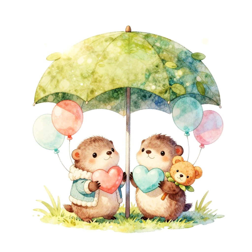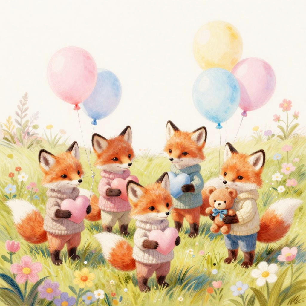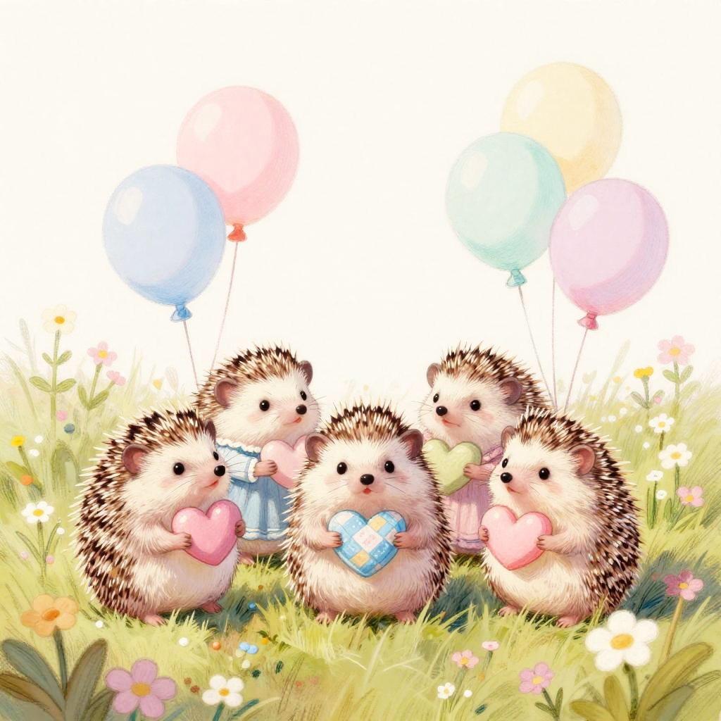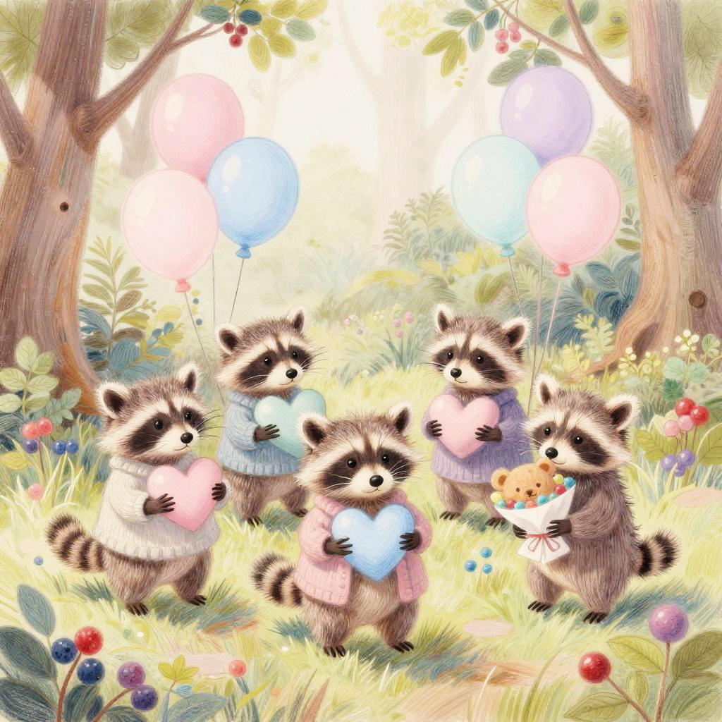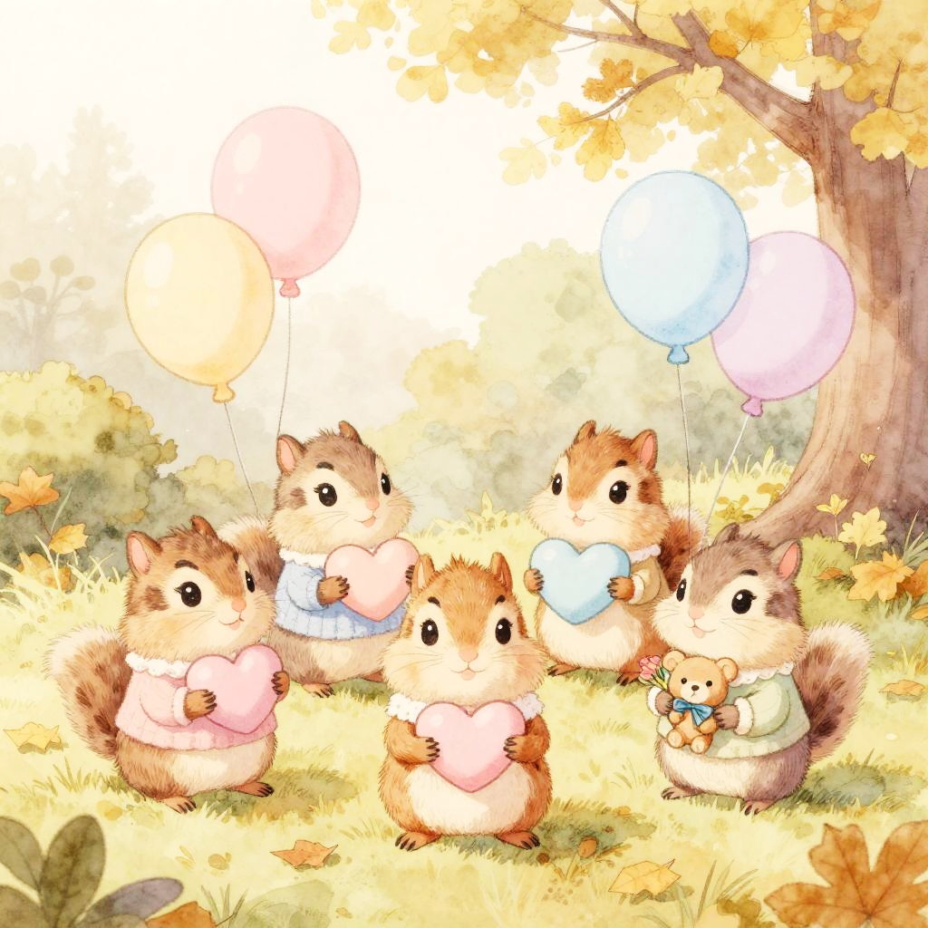 A group of tiny fuzzy ducklings in shady willow grove near a gentle creek, dressed in cozy clothing and holding heart-shaped objects, pastel balloons, and a teddy bear bouquet. Soft pastel palette with warm muted pink and blue accents, gentle hand-drawn textures, friendly linework, subtle paper grain. gouache with colored pencil. Charming and wholesome, soft glow, dappled light, minimal clutter, balanced composition.