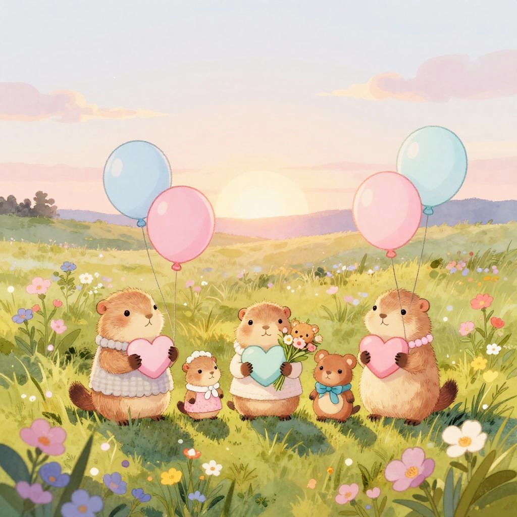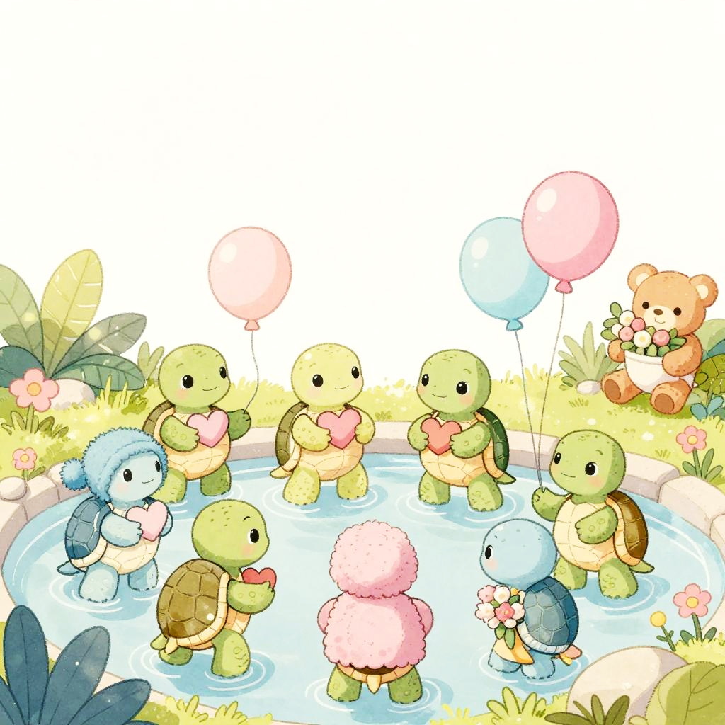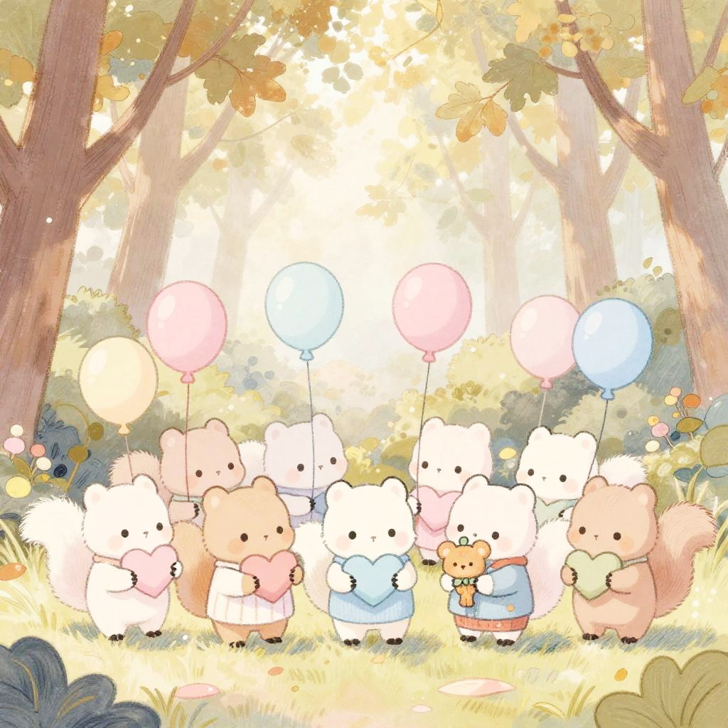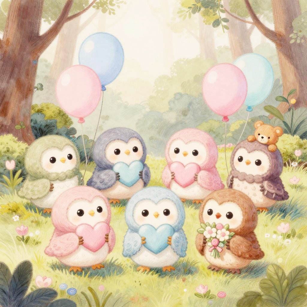 Illustration of a group of tiny fuzzy ducklings dressed in cozy pastel clothing, gathered near a gentle creek under a shady willow tree. The ducklings hold heart-shaped objects, pastel balloons, and a bouquet of teddy bears. The scene is rendered in soft pastel colors with warm pink and blue accents, featuring gentle hand-drawn textures and subtle paper grain, evoking a charming and wholesome atmosphere.