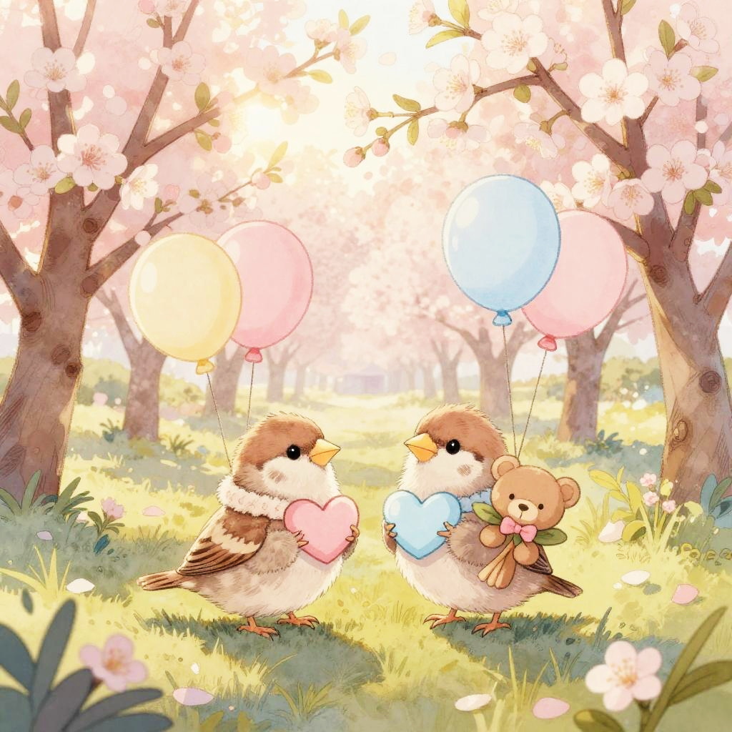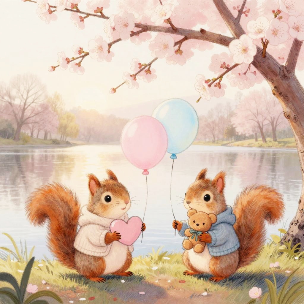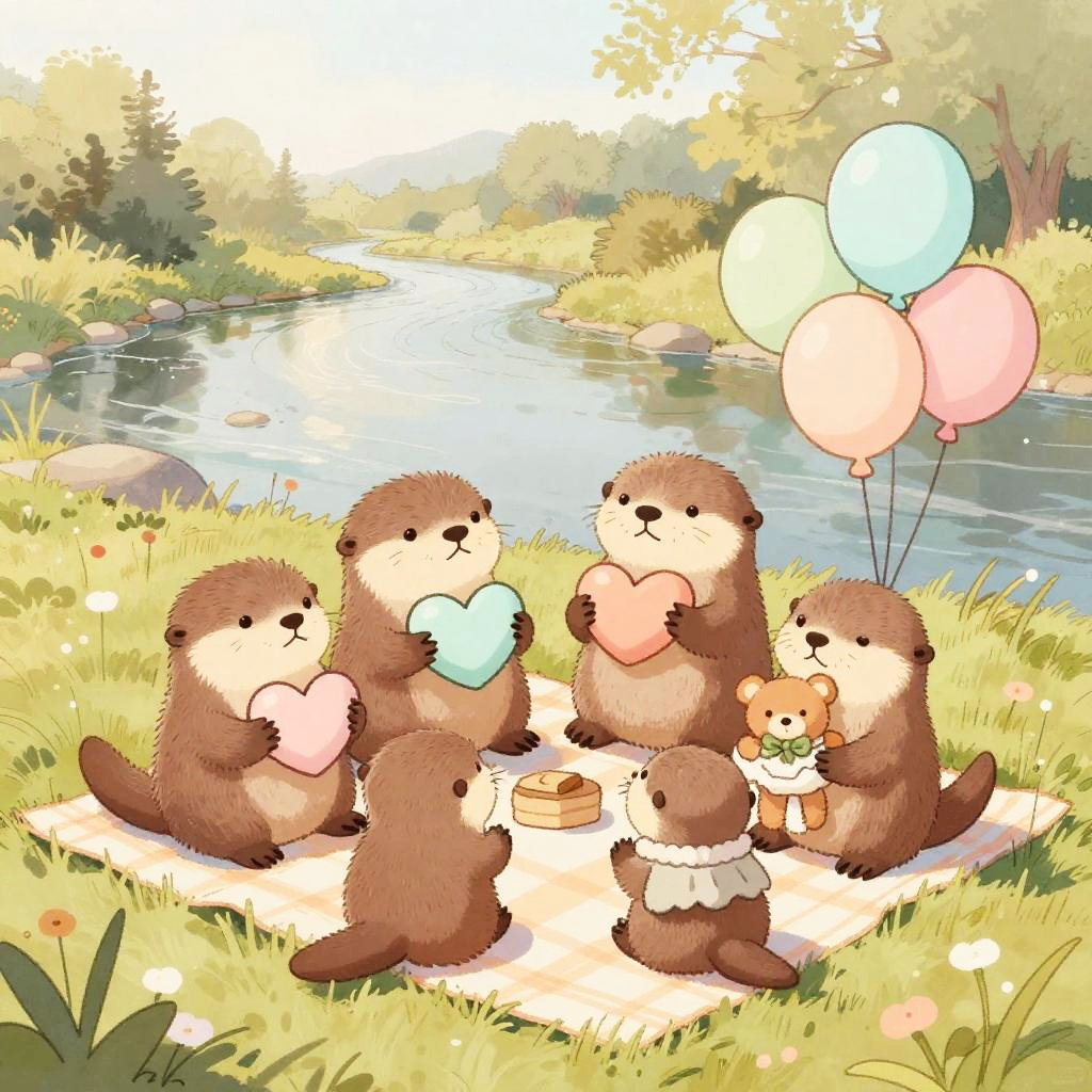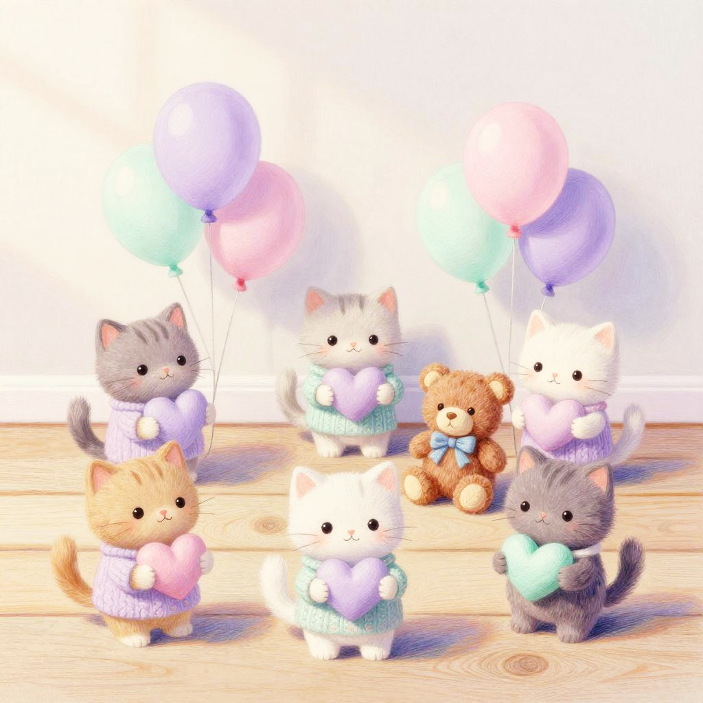 Illustration of a group of tiny fuzzy ducklings dressed in cozy pastel clothing, gathered near a gentle creek under a shady willow tree. The ducklings hold heart-shaped objects, pastel balloons, and a bouquet of teddy bears. The scene is rendered in soft pastel colors with warm pink and blue accents, featuring gentle hand-drawn textures and subtle paper grain, evoking a charming and wholesome atmosphere.
