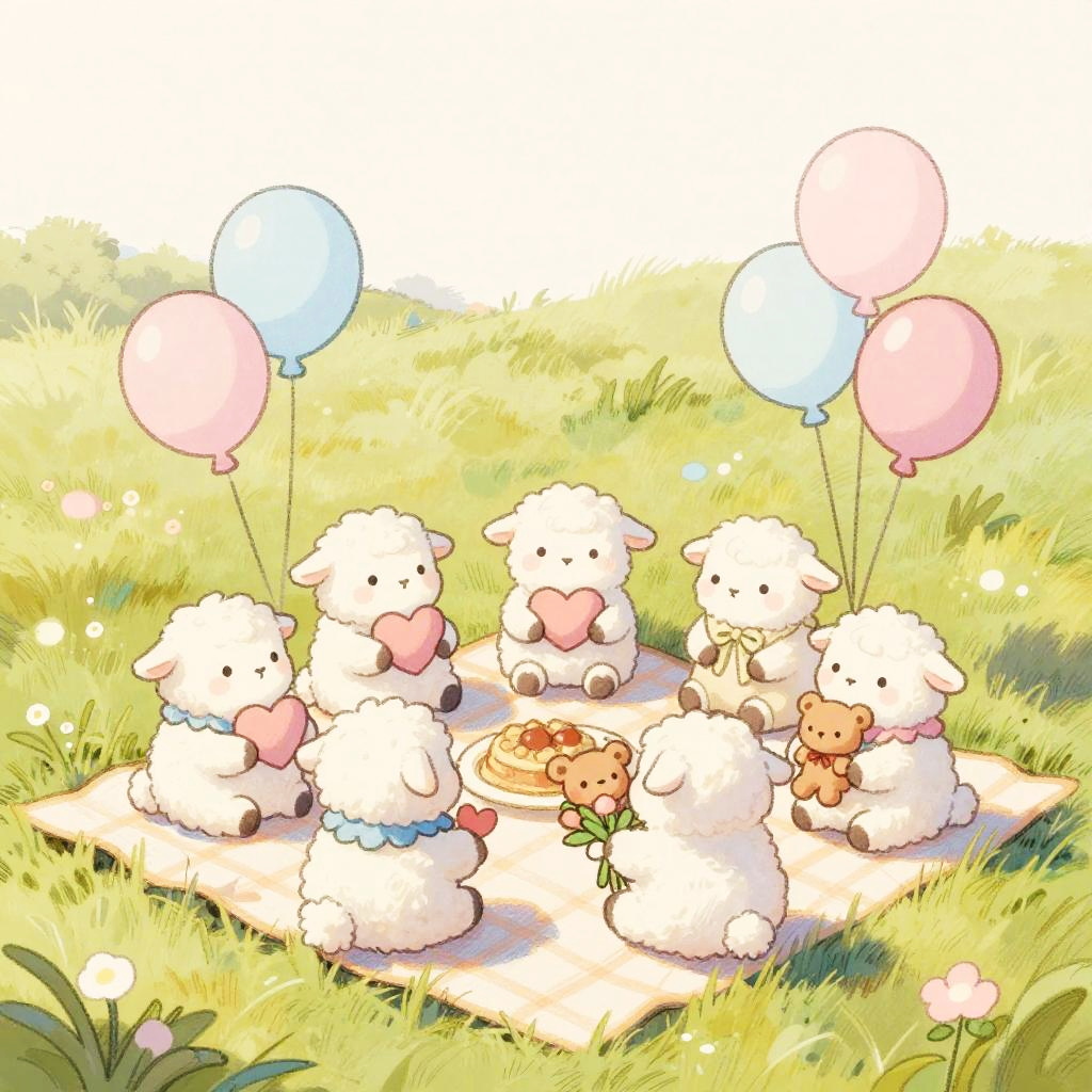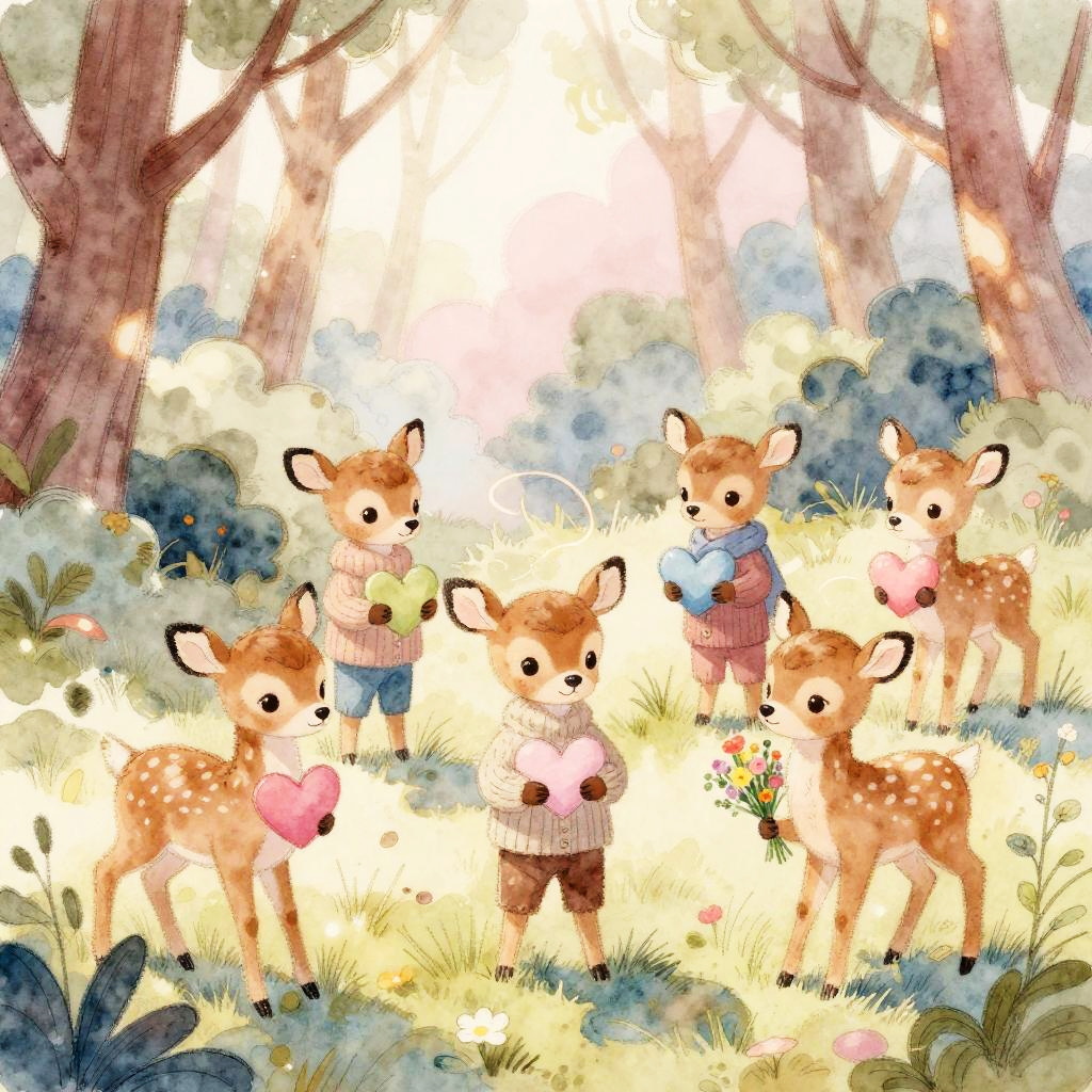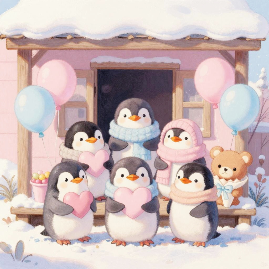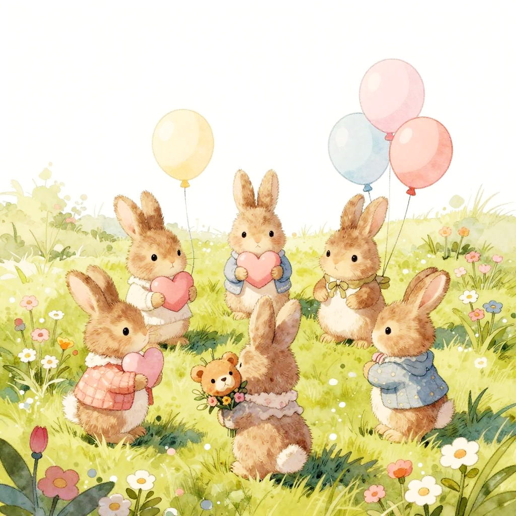 Illustration of a group of tiny fuzzy ducklings dressed in cozy pastel clothing, gathered near a gentle creek under a shady willow tree. The ducklings hold heart-shaped objects, pastel balloons, and a bouquet of teddy bears. The scene is rendered in soft pastel colors with warm pink and blue accents, featuring gentle hand-drawn textures and subtle paper grain, evoking a charming and wholesome atmosphere.