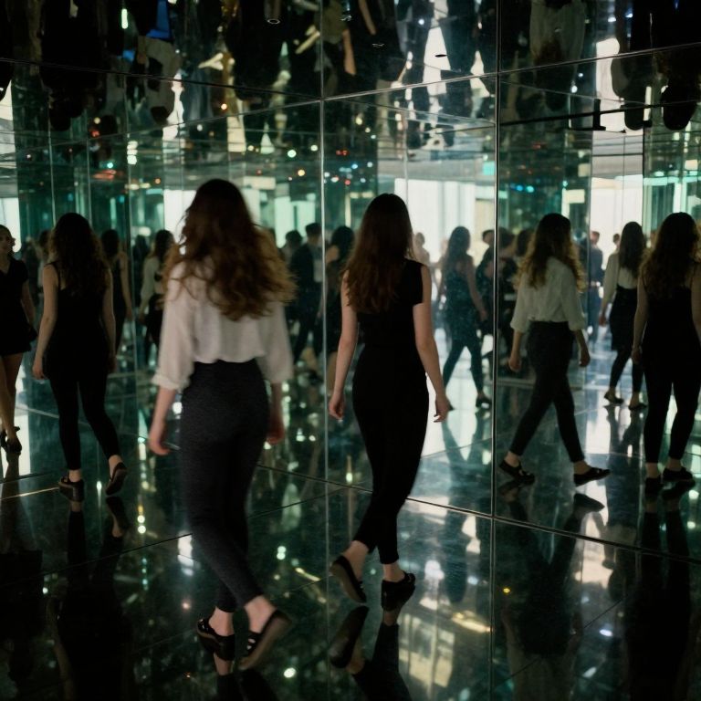 In a labyrinth of mirrors, figures navigate the infinite echoes of their own reflections, each step a silent dance between identity and illusion, where the weight of choice lingers in the air like a faint, unspoken question.