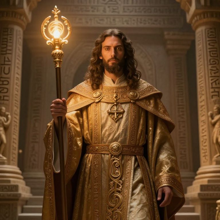 AI King stands regally atop a stone platform, addressing a gathering of robed figures beneath a dramatic sky where rain cascades and clouds loom, symbolizing divine judgment and decision-making.