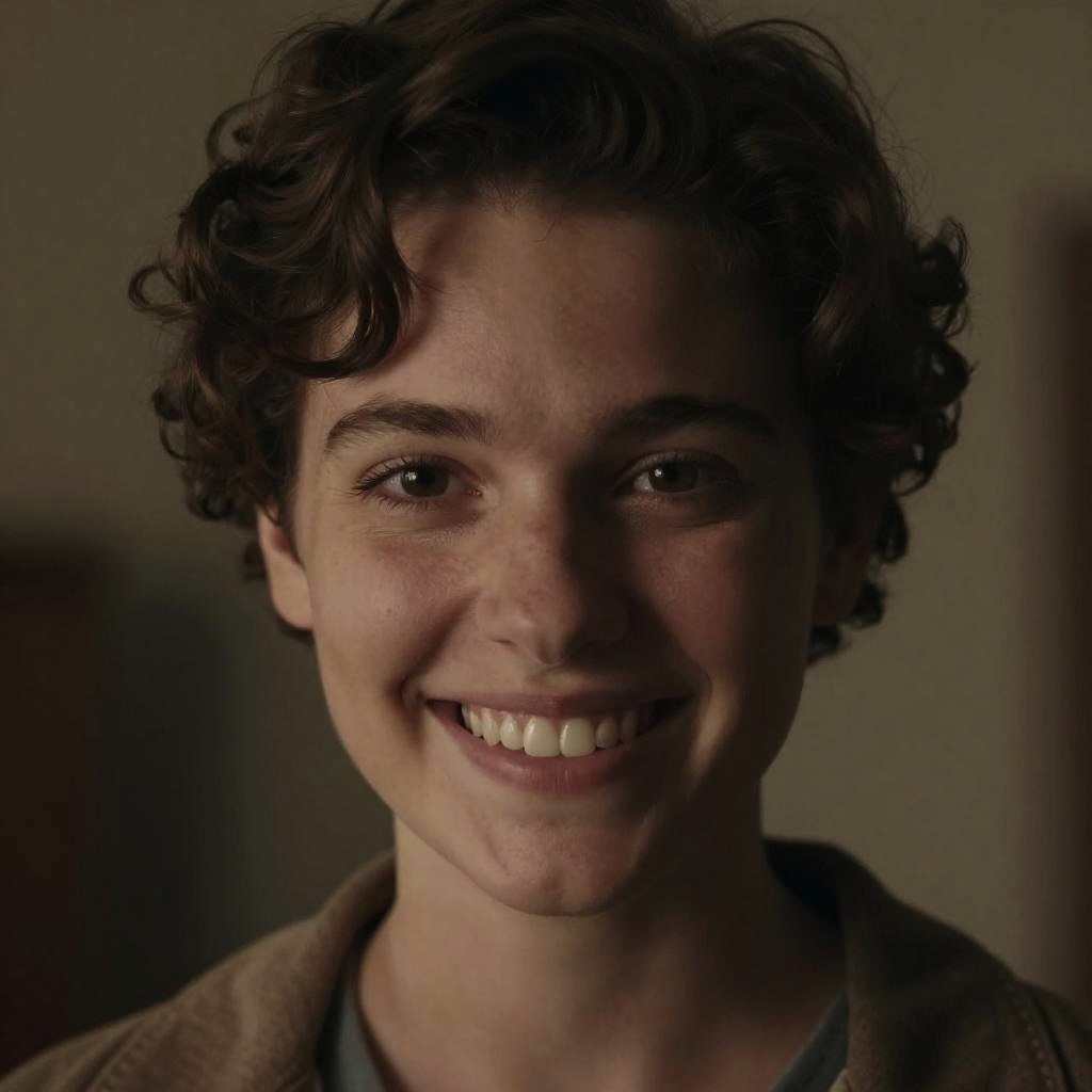 Photograph of a young person with short, curly brown hair and light skin, smiling widely to show straight, white teeth. The person's eyes are dark brown and slightly glossy. They are wearing a brown jacket over a dark blue shirt. The background is blurred and dark, creating a stark contrast that highlights the subject's face. The lighting is soft, casting gentle shadows that enhance the person's facial features. The overall mood of the image is warm and friendly.