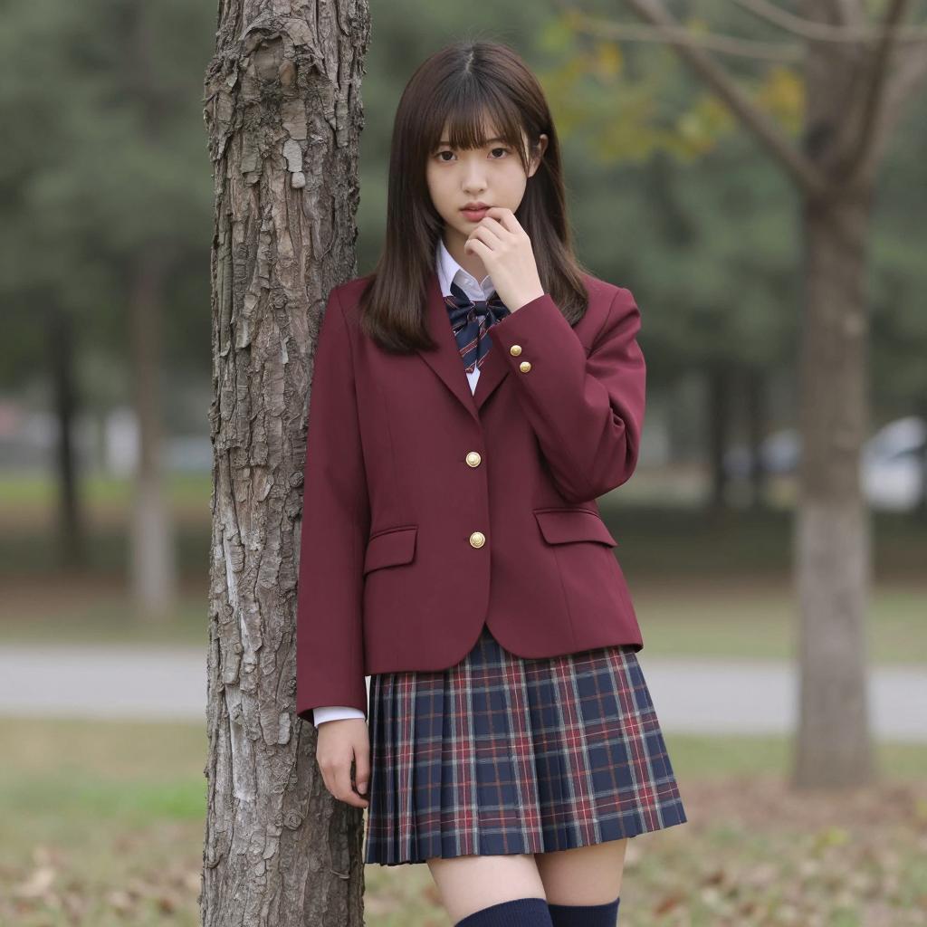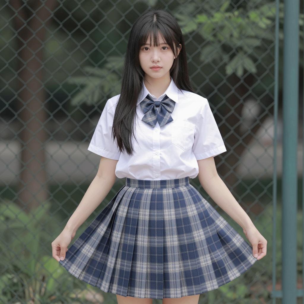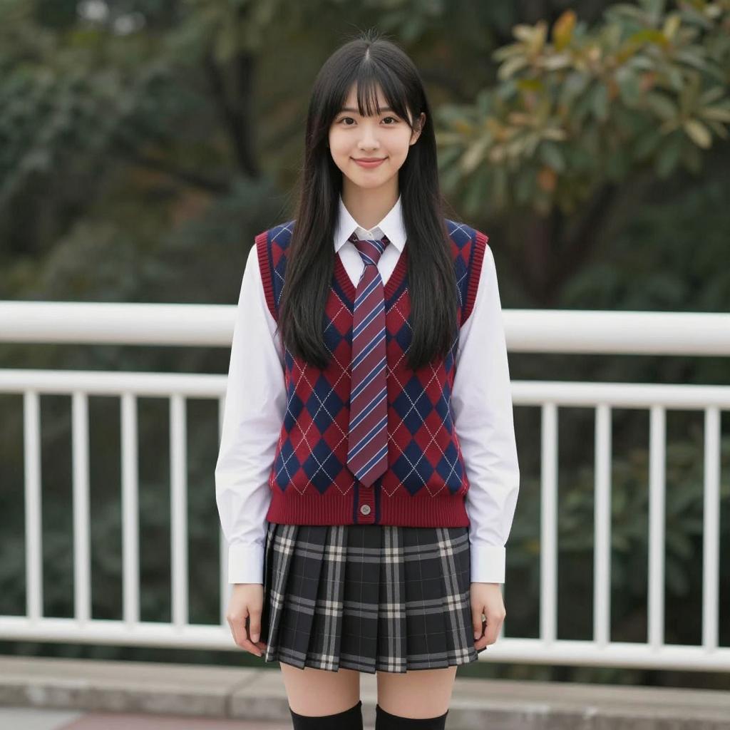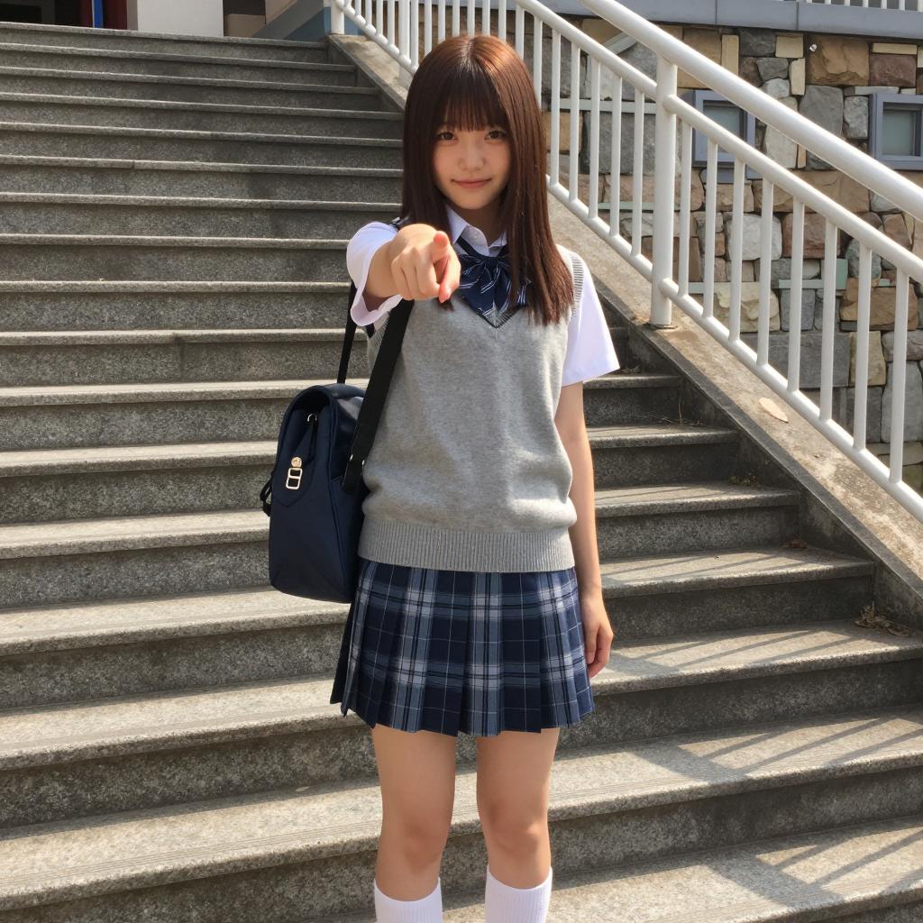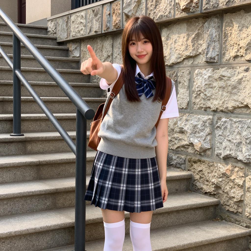 Asian woman with straight brown hair, bangs, smiling, wearing gray sleeveless sweater, white shirt, plaid skirt, white thigh-high socks, blue necktie, brown backpack, pointing forward. Standing on outdoor stone staircase, metal railing on left, stone wall in background. Sunlight illuminates scene.