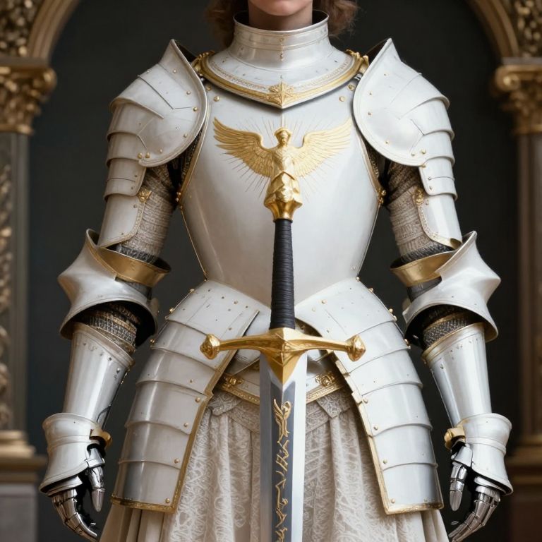 The image depicts a highly detailed and intricate scene featuring a person in elaborate white and gold armor, reminiscent of Joan of Arc. The armor is adorned with intricate metalwork and features a prominent breastplate with a radiant, angelic design at its center. The person is positioned in front of a dark, ornate background, which adds a sense of depth and mystery to the composition. The armor is complemented by a great sword with angelic runes along the blade, exuding a sense of power and divinity. The overall color scheme is dominated by shades of white and gold, creating a striking contrast against the dark background. The scene is illuminated by a soft, ethereal light, suggesting a divine or otherworldly presence, possibly hinting at a connection to heaven. The composition is balanced, with the person and armor occupying the central focus, while the background elements provide context and enhance the dramatic effect.