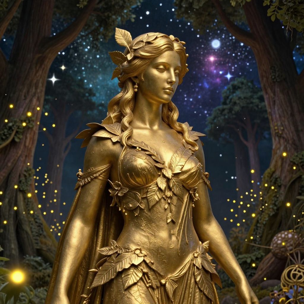 Photograph of a golden, leaf-adorned statue of a serene, fair-skinned woman with wavy hair and a leaf crown, standing in a magical forest. Her dress, made of intricate leaves, reveals a modest cleavage and a slender, toned midriff. The background features tall trees with glowing, starry night sky and twinkling fireflies, creating an ethereal, enchanted atmosphere. The statue's detailed texture contrasts with the soft, blurred forest and glowing lights, emphasizing her majestic, nature-inspired elegance.