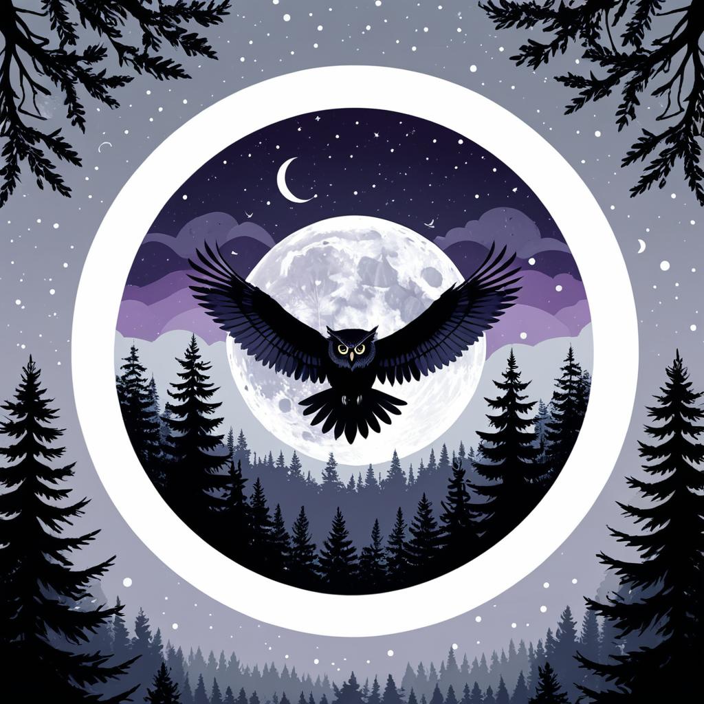A circular geometric design featuring a owl flying through the moonlit sky with a misty forest silhouette with cool greys and purples. Vector illustration accentuating the beauty of nature with clean white background and symmetrical patterns.