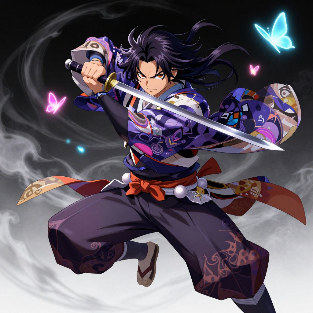Vivid anime illustration of a fierce warrior with flowing dark hair wielding a slender sword in a dynamic action pose. The character is dressed in traditional Japanese attire with modern fantasy elements, featuring detailed patterns and a red obi belt. The scene includes ethereal mist swirling around and glowing neon butterflies in blue and pink hues, set against a dark contrasting background.