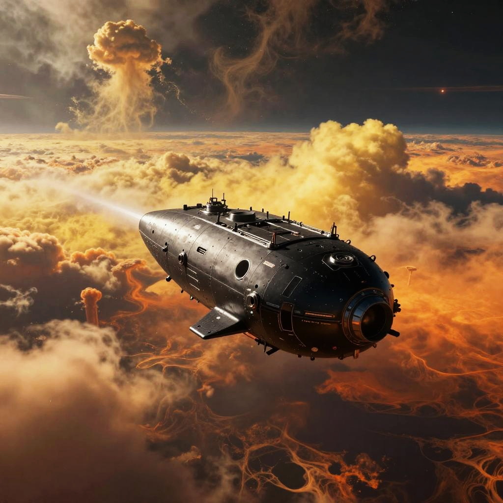 The Venera Maxima Blacked probe descending through Venusian thick clouds, sleek black design contrasted against yellow and orange acidic clouds, a surreal, otherworldly sci-fi landscape bursting with vivid colors and intricate planetary details.
