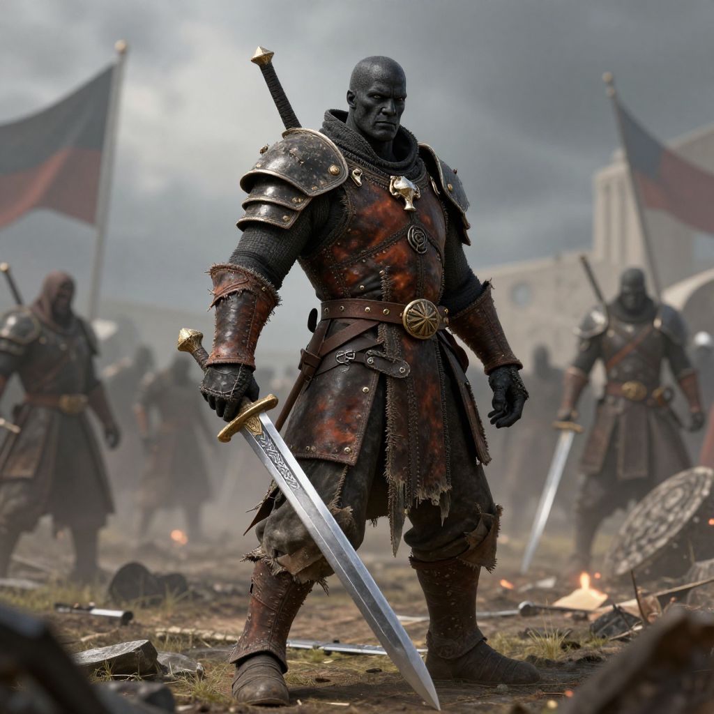 A digital artwork depicts a muscular, bald man in heavy, silver medieval armor standing in a grassy meadow with a flock of sheep. He has a stern expression and a speech bubble saying "Shepherd." The armor includes shoulder pads, a chest plate, and a belt with a sword sheathed on his back. The background features rolling green hills, a clear blue sky, and scattered trees. The sheep are white with a brown one in the foreground. The image blends realistic textures with a slightly cartoonish style.