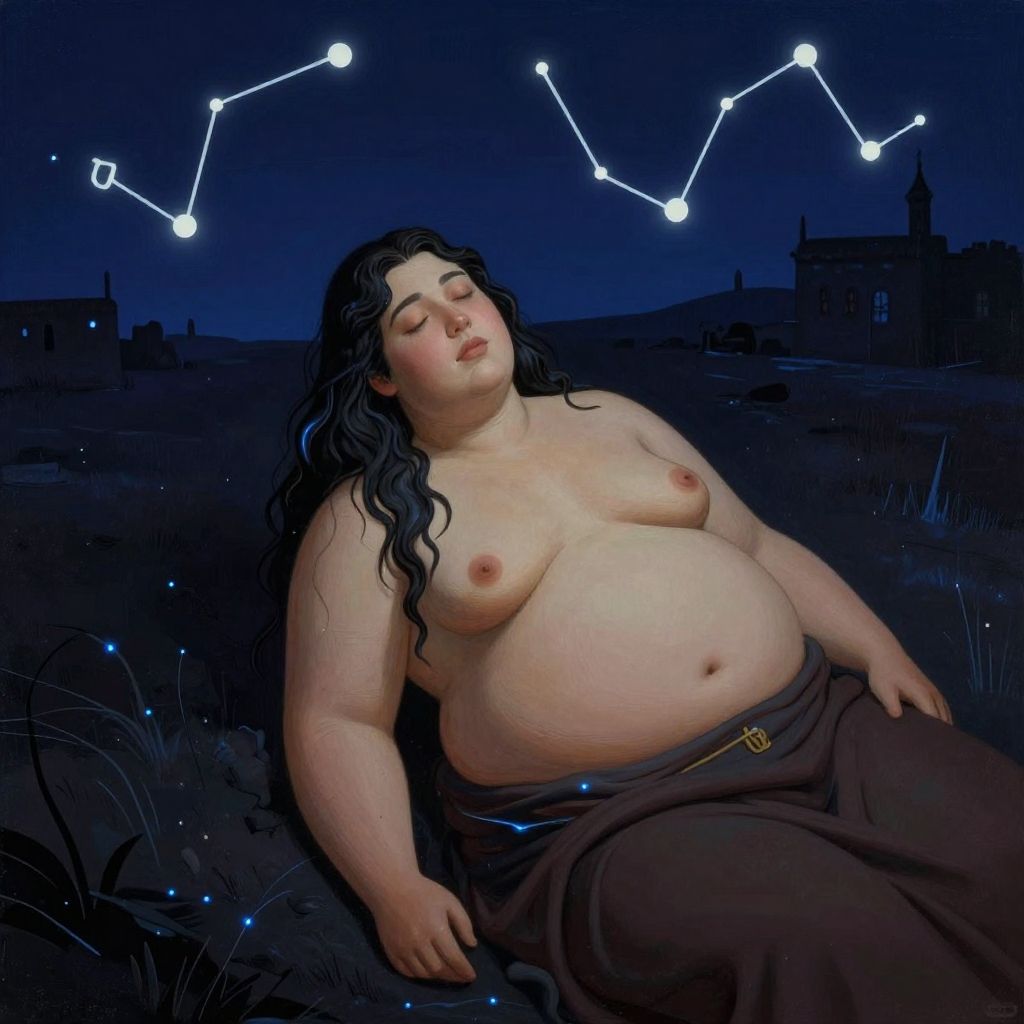 1girl, grand Drawing, dark Painting, masterpiece, high angle shot of a Ceramic Detestable morbidly obese Moroccan (Male Marshal:1.3), he has Byzantine hair, simple dark indigo background, crowded field and Capricornus constellation in background, at Twilight, tilt shift, Simple illustration, Light, Generative Art, Black lighting, F/5, Kinemacolor, arcane, electric blue details, natural skin texture, realistic cozy face, RTX, UHD