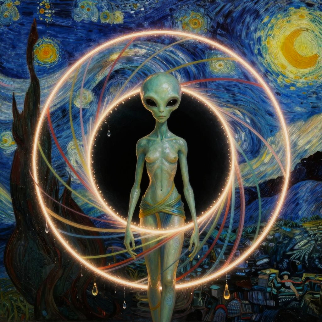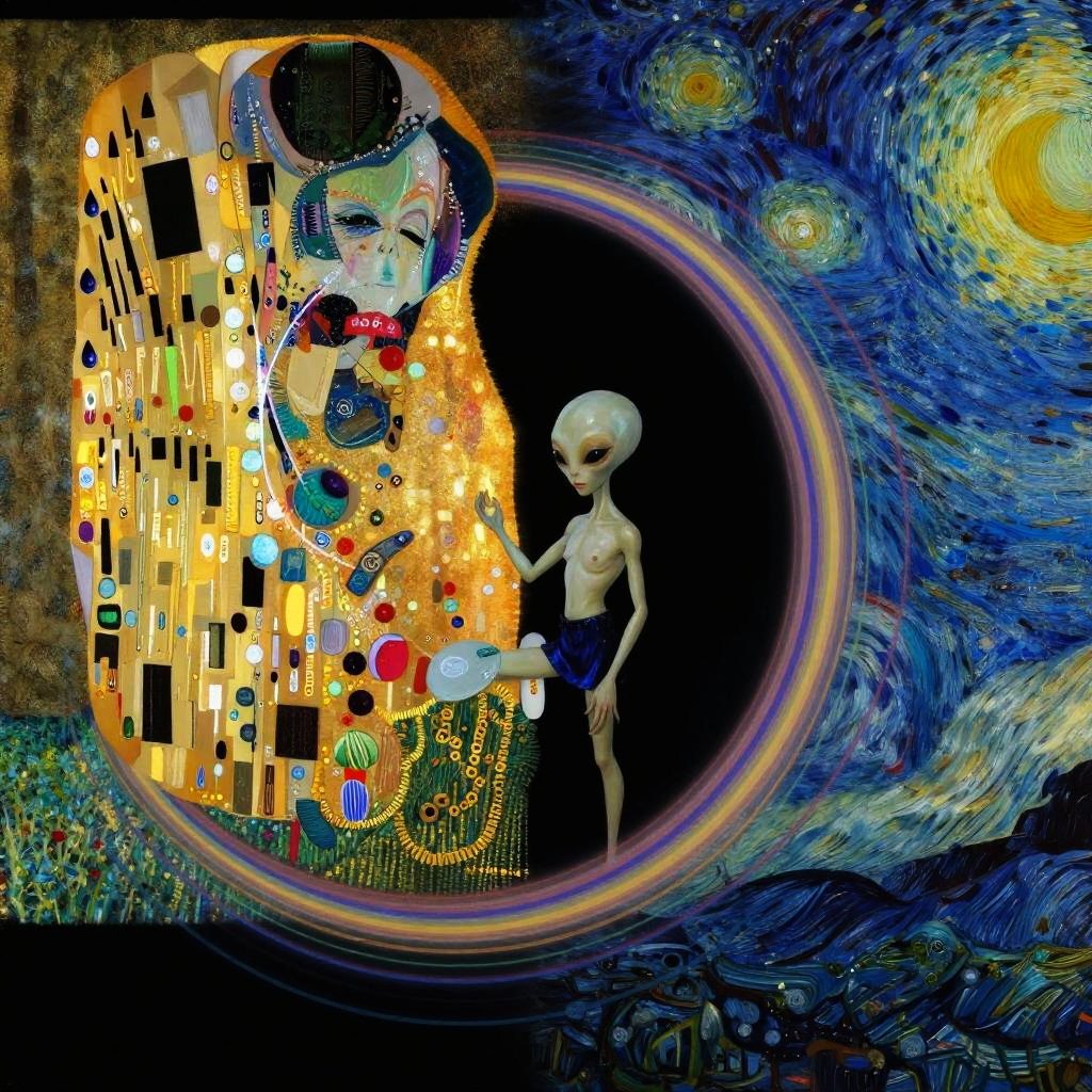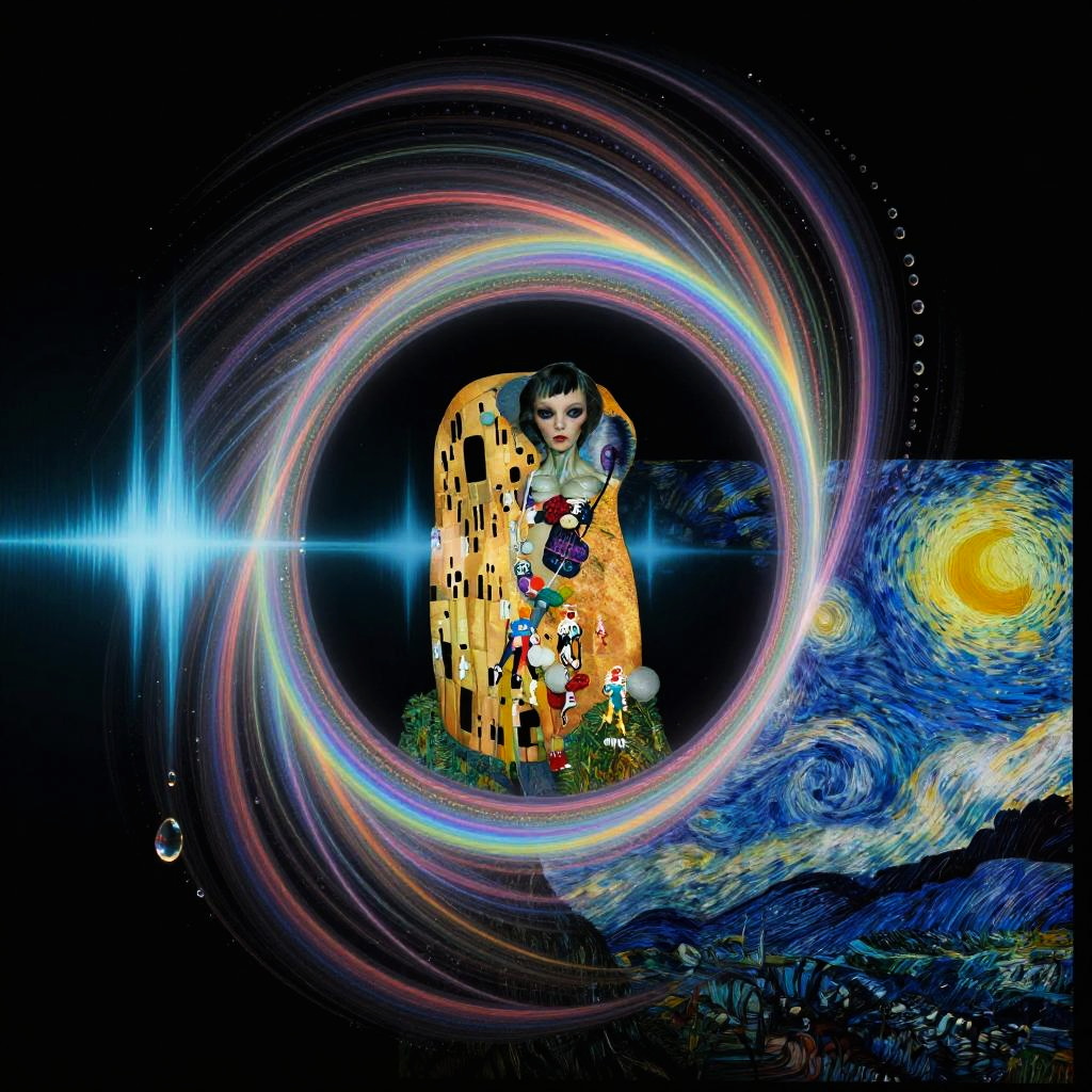 Young alien musician, young alien woman inside fibonacci spiral, sound waves, abstract colored lines and drops, surreal brush strokes, black background, by Gustav Klimt, by Vincent Van Gogh, by Gerhard Richter