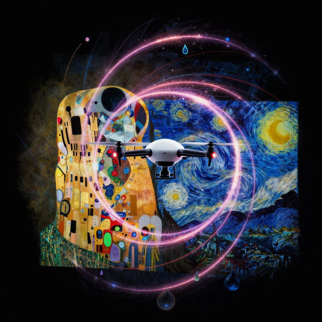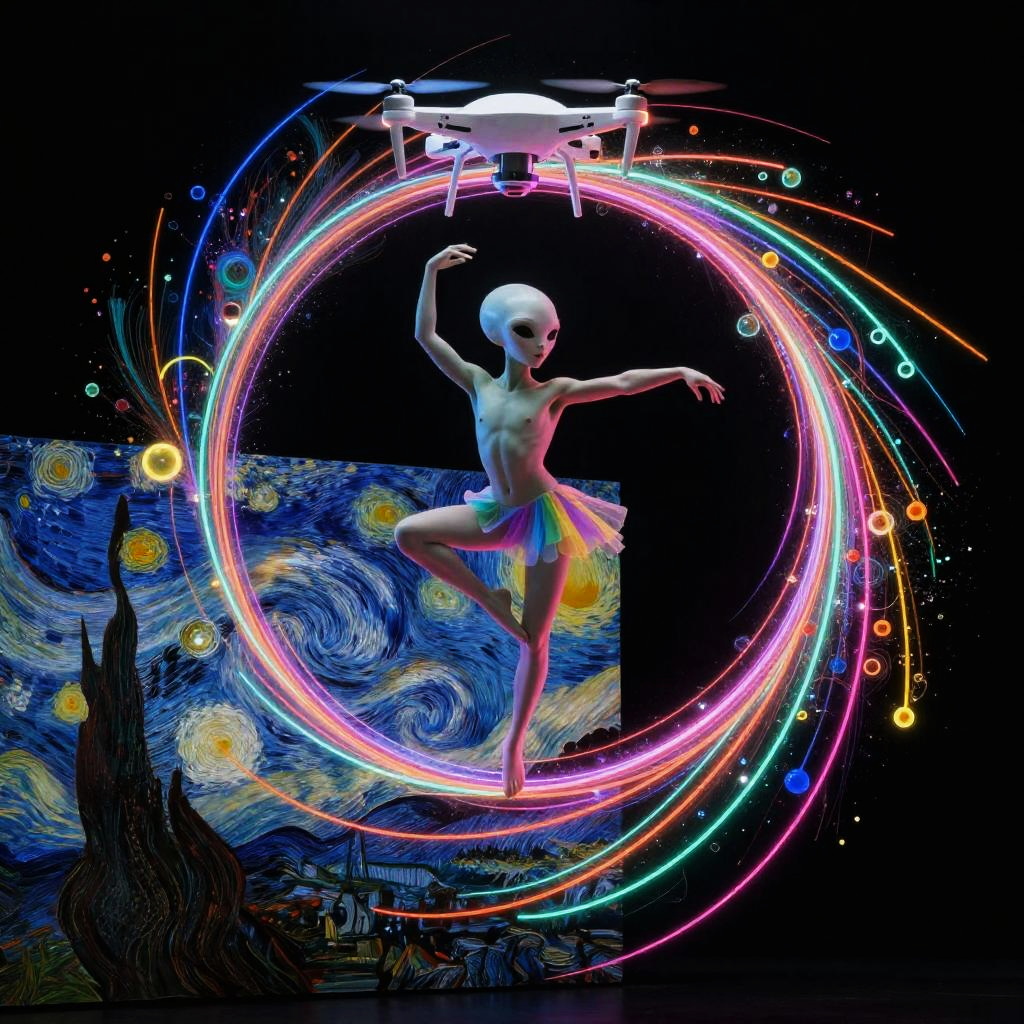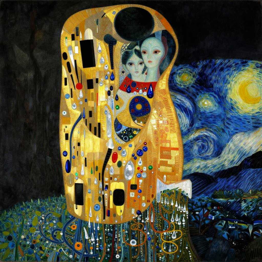 Young alien musician, young alien woman inside fibonacci spiral, sound waves, abstract colored lines and drops, surreal brush strokes, black background, by Gustav Klimt, by Vincent Van Gogh, by Gerhard Richter