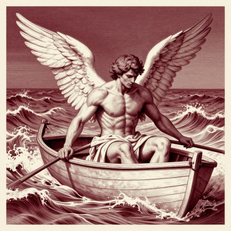 Traditional painting of a muscular young male angel with large wings sitting in a wooden rowing boat on a turbulent sea with big waves. The artwork is done in a detailed, cinematic poster style using a burgundy and off-white color palette.