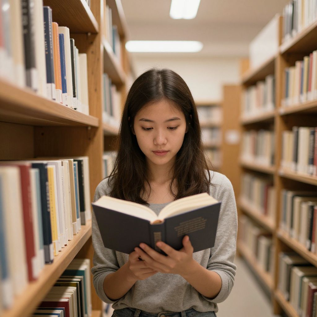 Photograph of an Asian woman with straight, dark brown hair, wearing a light gray, long-sleeve top, standing in a library aisle. She is focused on reading an open black book, holding it with both hands. The background features tall, wooden bookshelves filled with various colored books, extending into a blurred depth. The library has bright, fluorescent lighting and a clean, organized appearance. The woman has a calm, concentrated expression, and the image is sharply focused on her, with the background slightly out of focus, creating a depth effect.