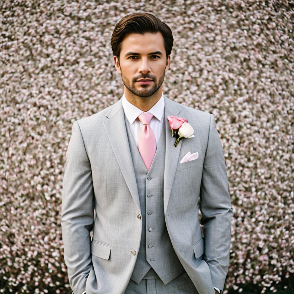 Photorealistic portrait of a handsome man wearing a light grey three-piece suit with a pink tie and white dress shirt. He has a pink and white flower boutonniere on his left lapel and stands outdoors against a beige blurred floral background. The man has neatly styled brown hair, light stubble, and a serious expression, embodying a formal wedding theme.