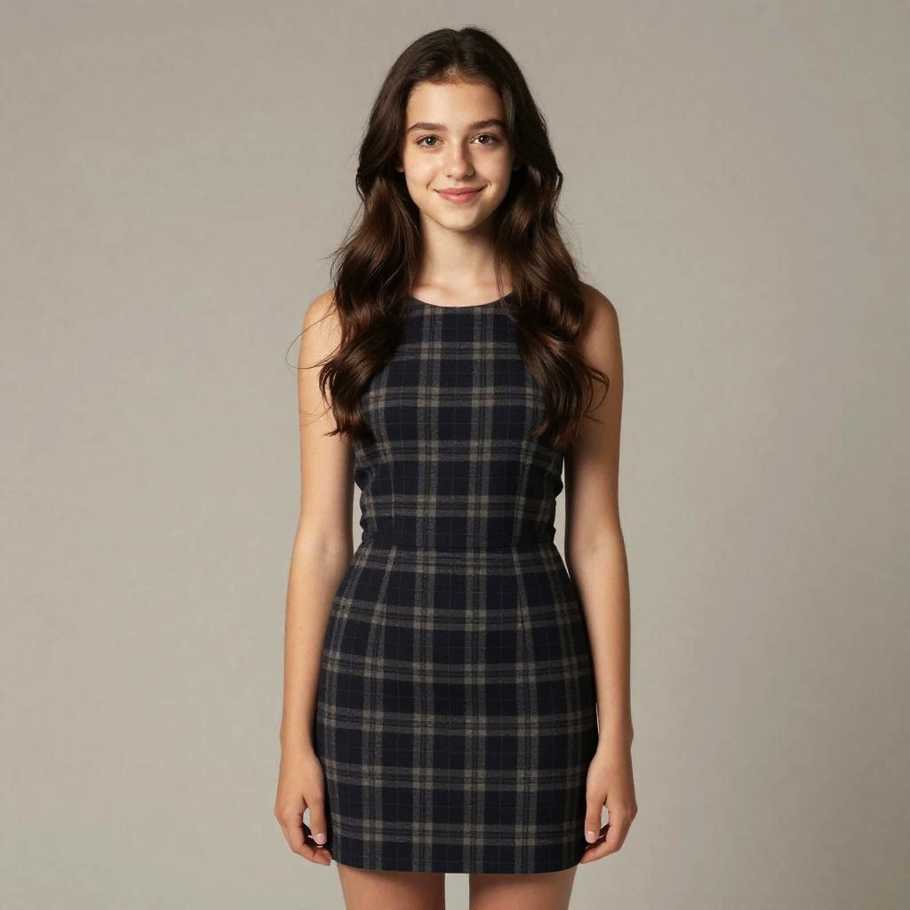 (8k, RAW photo, best quality, masterpiece:1.2), (realistic, photo-realistic:1.37), ultra-detailed, (detailed beautiful girl:1.4), 1 girl, 22 years old, (dark check skirt), looking at viewer, ((full body shot)), smile, big face, mid hair