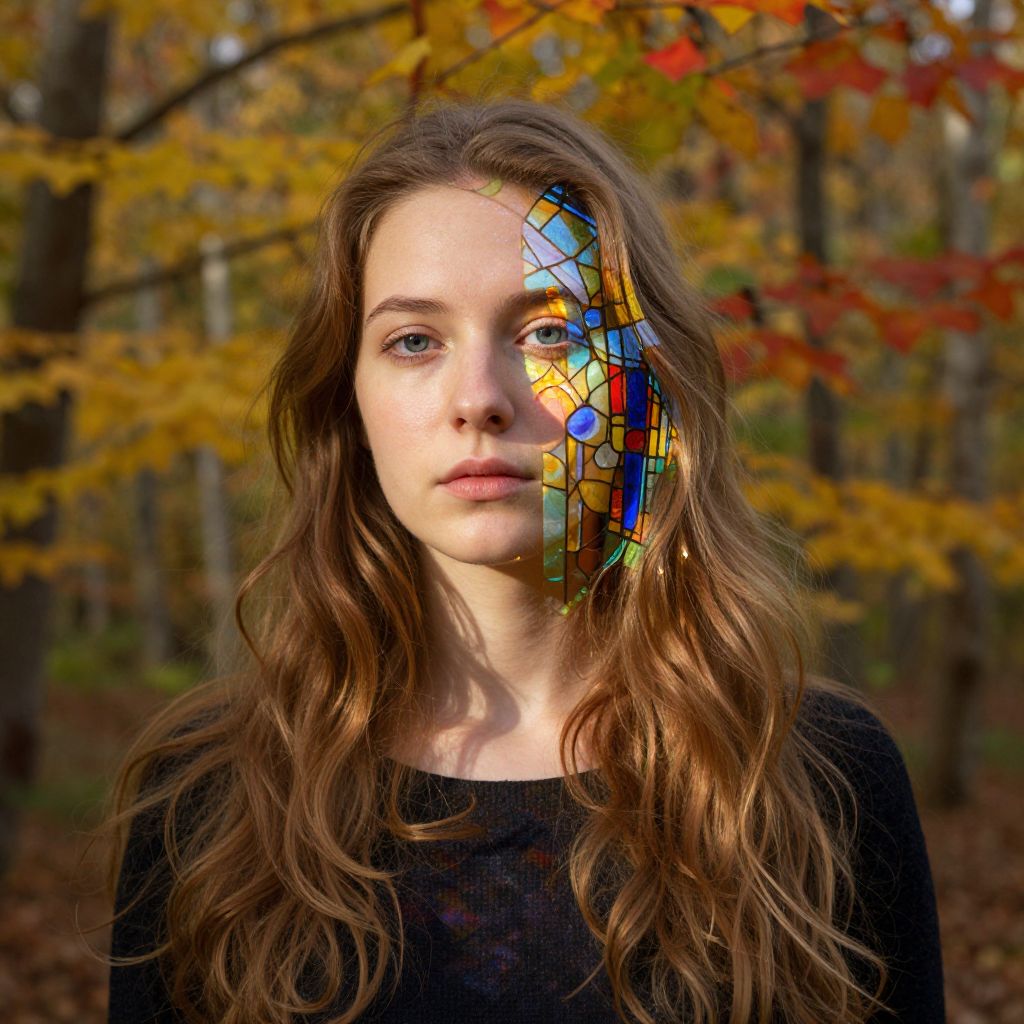 Envision a captivating double exposure portrait of a youthful woman with cascading locks amidst an autumn forest's vibrant palette. The overlay showcases intricate stained glass patterns seamlessly merging with her complexion, exuding ethereal charm. As sunlight filters through the foliage and translucent designs on her face, it casts mesmerizing shadows and highlights that reveal serenity and enigma in her expression. This harmonious scene narrates a tale of nature's fleeting beauty intertwined with humanity's enduring spirit as she stands rooted yet ever-evolving, embodying the timeless interplay between stability and transformation.
