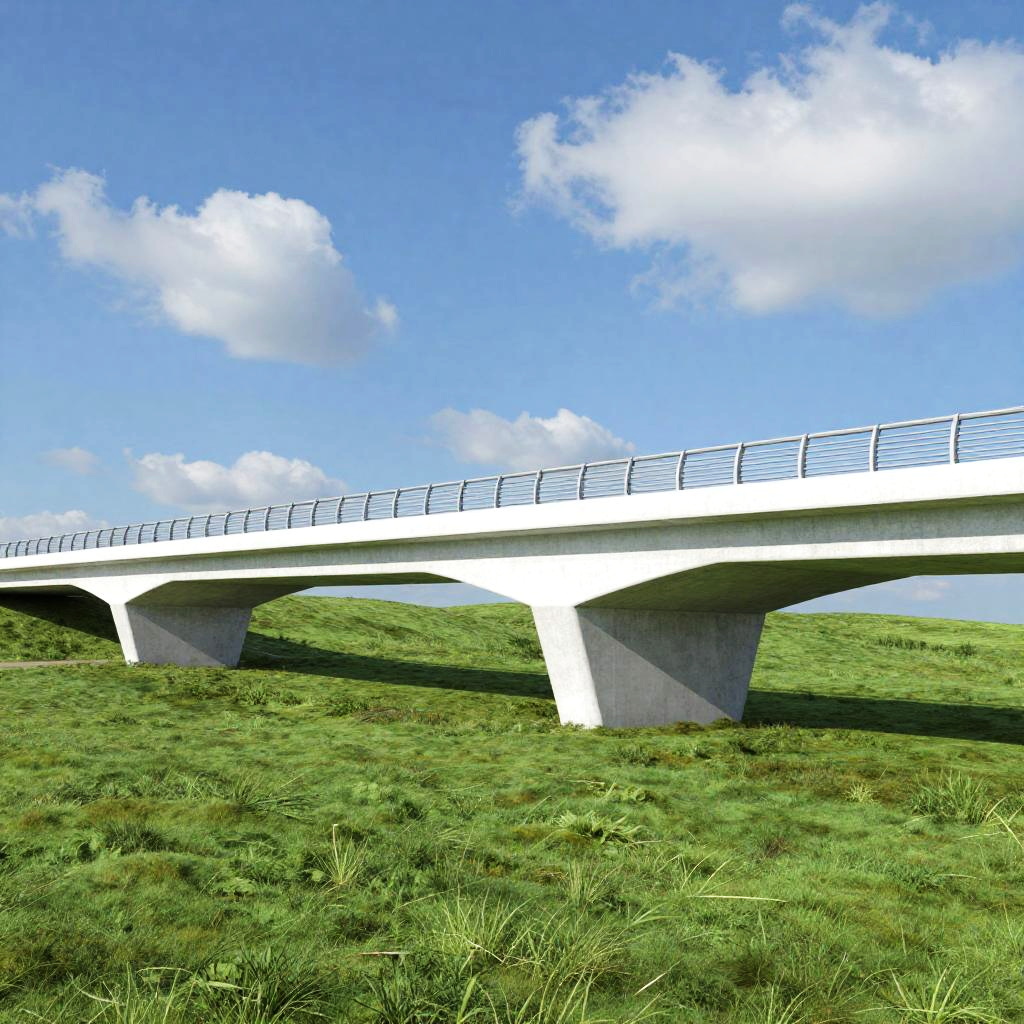 This is a digital CGI image of a modern, white concrete bridge with distinctive curved supports and metal railings. The bridge spans a lush green landscape with a bright blue sky and fluffy white clouds in the background. The image has a high-contrast, almost cartoon-like style with sharp edges and vibrant colors. The bridge is positioned horizontally across the center of the image.