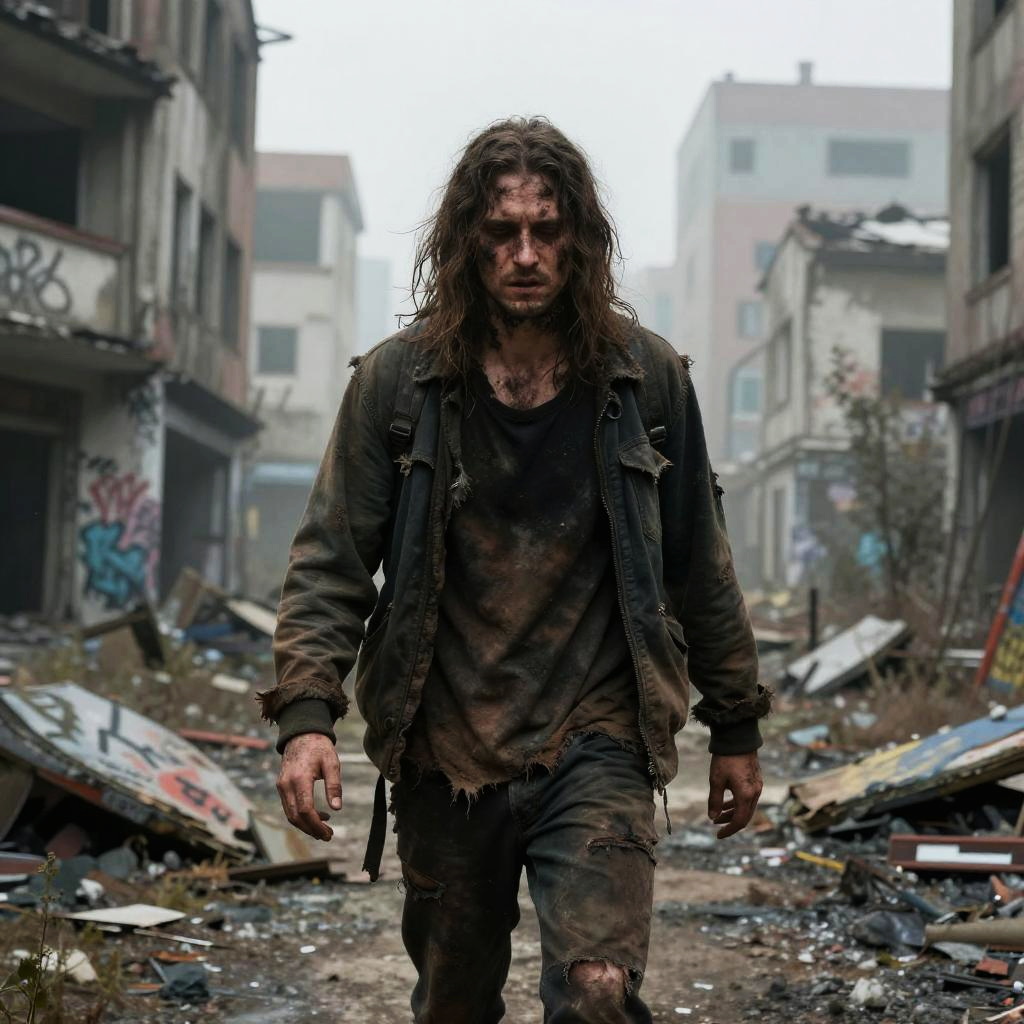 Ugly man with long hair wandering through a post-apocalyptic city, grimy face covered in dirt, wild shaggy brown hair, torn clothes, dystopian setting, abandoned buildings with graffiti, foggy atmosphere, hyper-realistic, intense shadows
