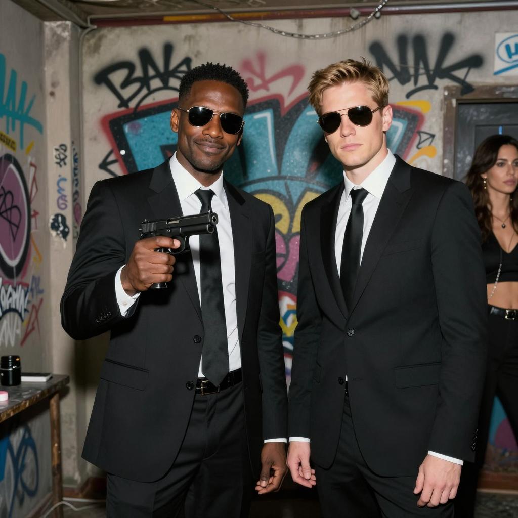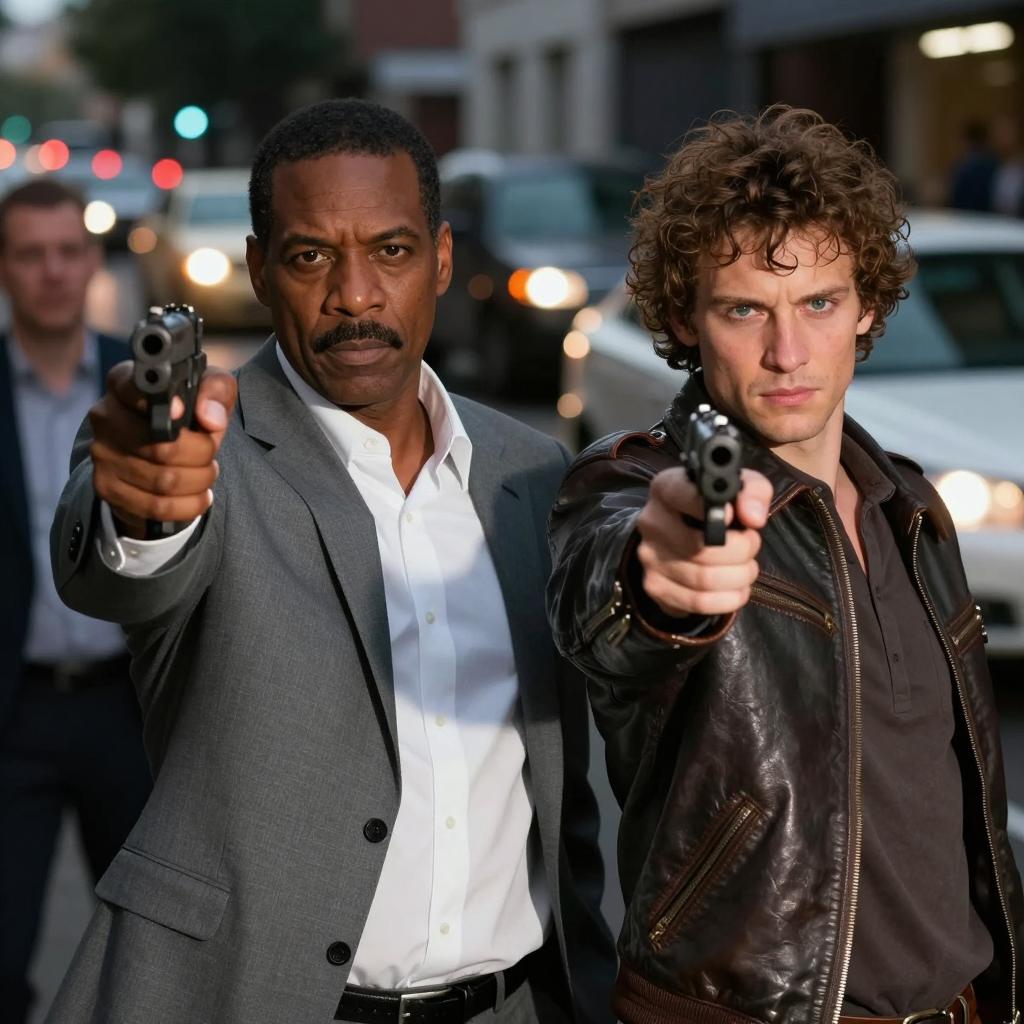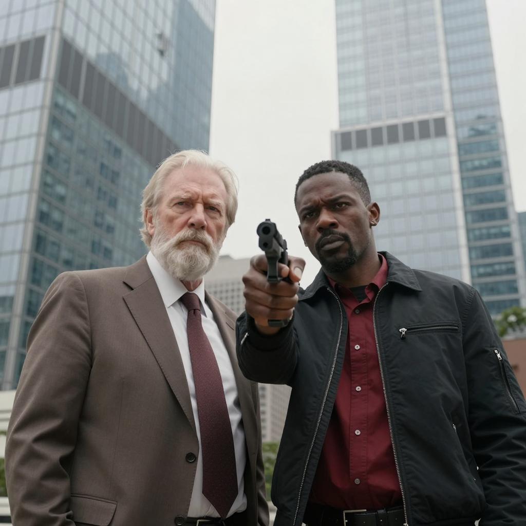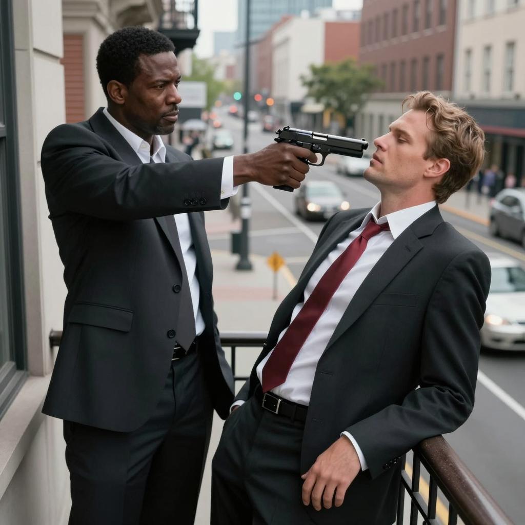 Photograph of two men in suits on a balcony. Black man in dark suit and white shirt, pointing a handgun at white man in black suit with red tie, leaning back. Urban street with cars in background. Intense expressions.