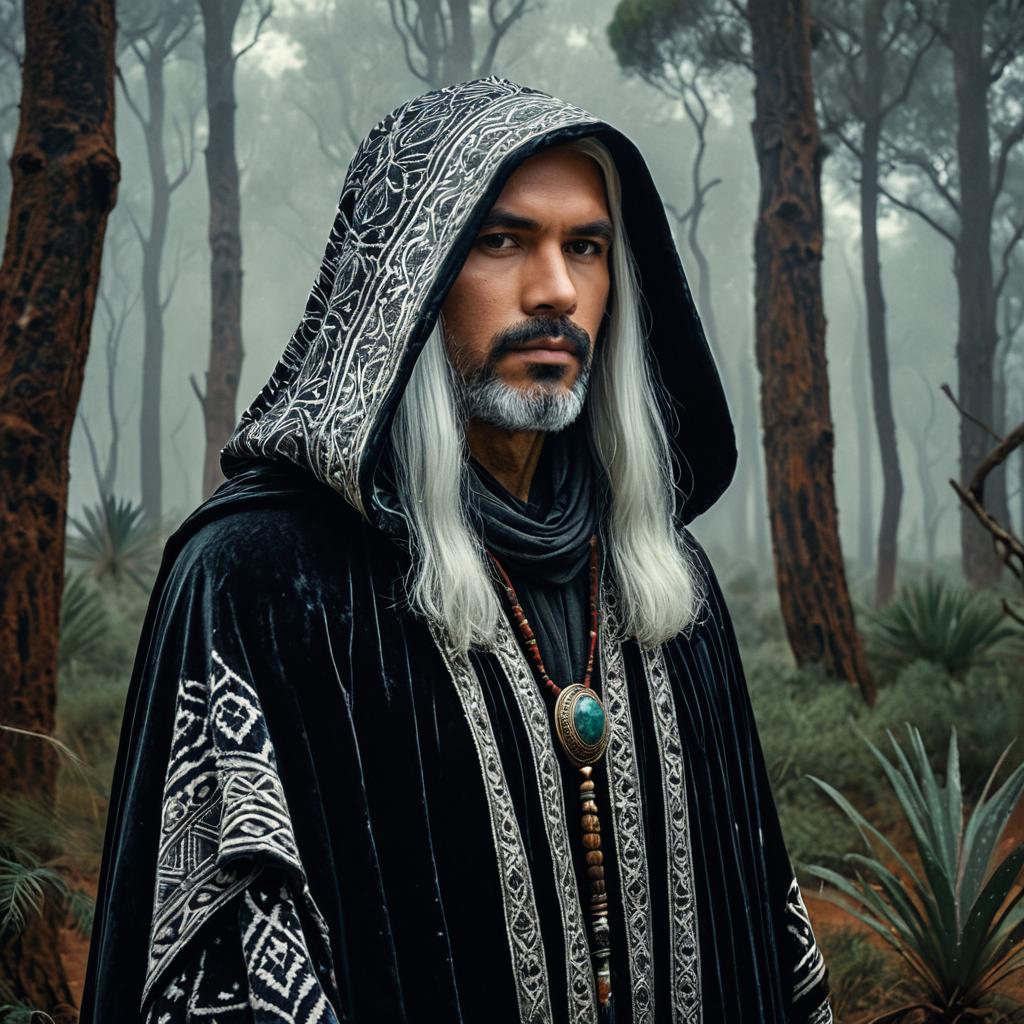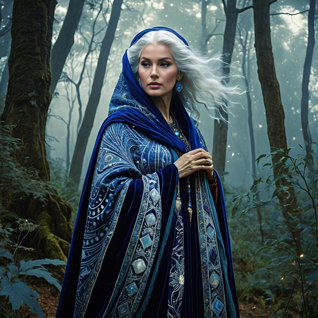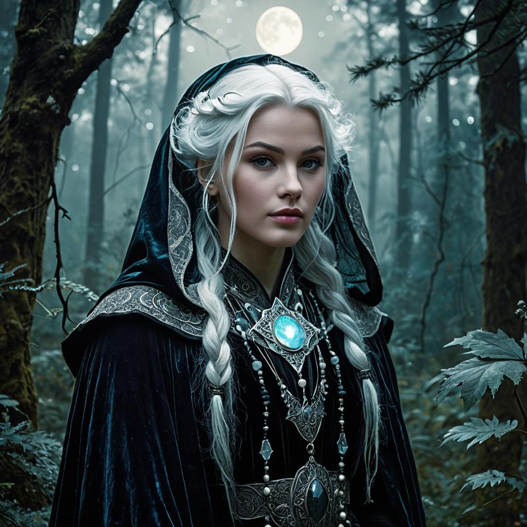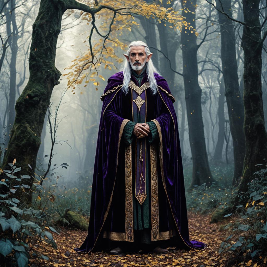 Portrait of a dwarven warrior with luminescent white hair, draped in deep ruby velvet hooded cape with golden Celtic knots, standing in a misty ancient forest glade. Painted in the style of John Singer Sargent, Albert Bierstadt. Fine detail, hyperrealistic, rendered in Octane.