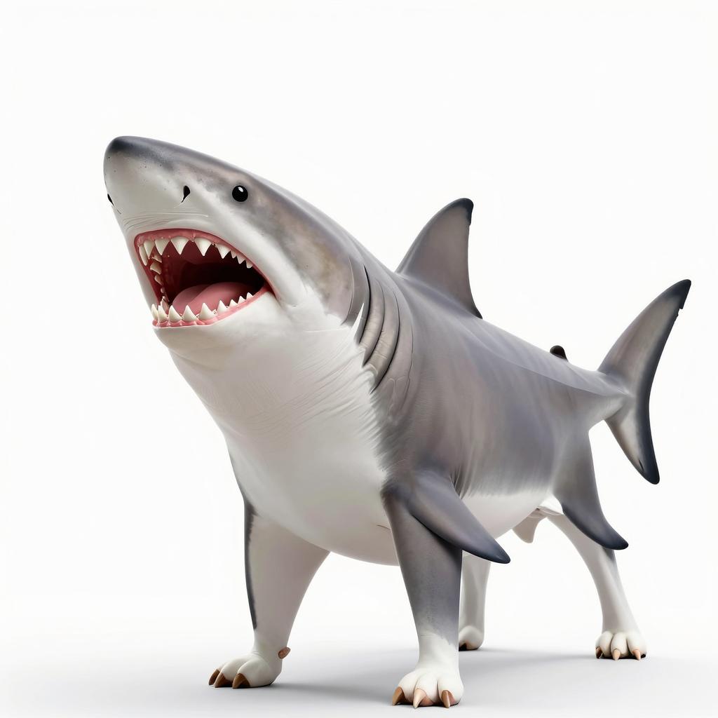 Compilation a medium-sized, muscular dog with the head of a great white shark seamlessly attached. The shark head should be proportionate, featuring a broad snout, black eyes, and a wide-open mouth displaying multiple rows of sharp, triangular teeth. Retain the distinctive gray-to-white gradient coloration of the shark, blending it naturally with the dogs body.,