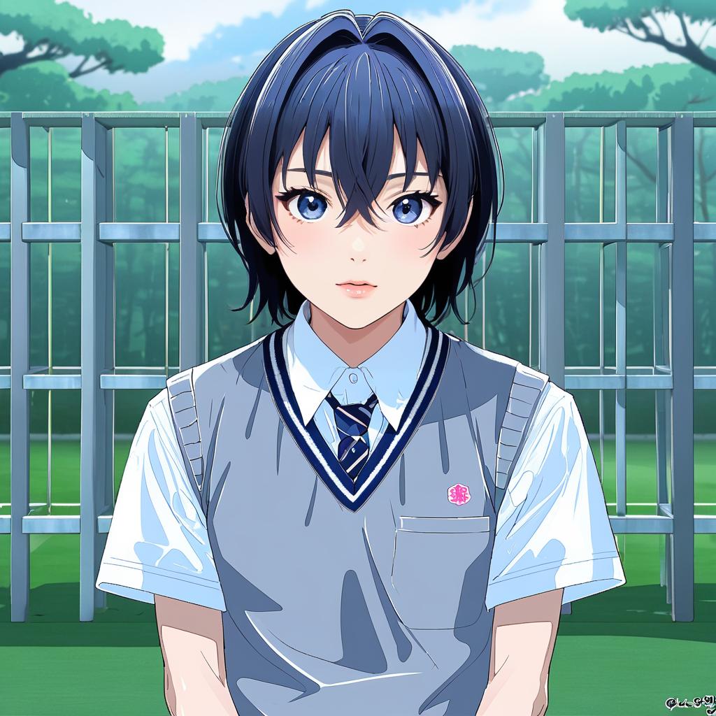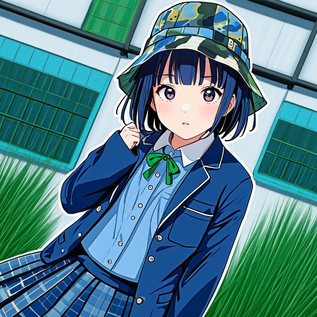 Asakusa midori, eizouken ni wa te wo dasu na!, 1girl, black eyes, hair between eyes, short hair, black hair, school uniform, school uniform, blue jacket, blue skirt, pleated skirt, bucket hat, camouflage headwear, long sleeves, by artist ebi 193, anime