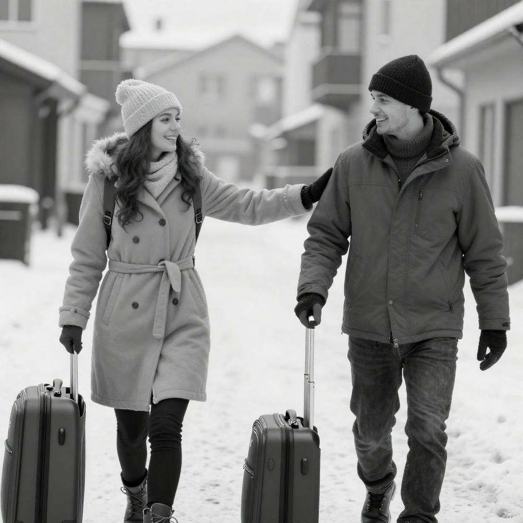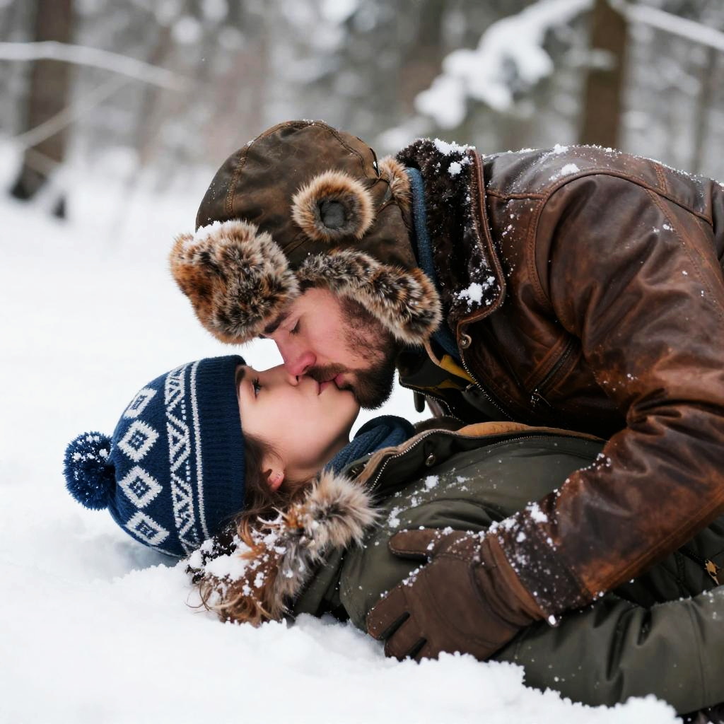 Photograph of a couple sitting on a wooden bench in a snowy outdoor setting. The woman with blonde hair, blue knit hat, black coat, and gray leggings rests her head on the man's shoulder. The man has a beard, maroon knit hat, gray jacket, and blue jeans. Snow falls around them. The woman holds a red cup. The man's legs are crossed. Background includes a window and holiday decorations.