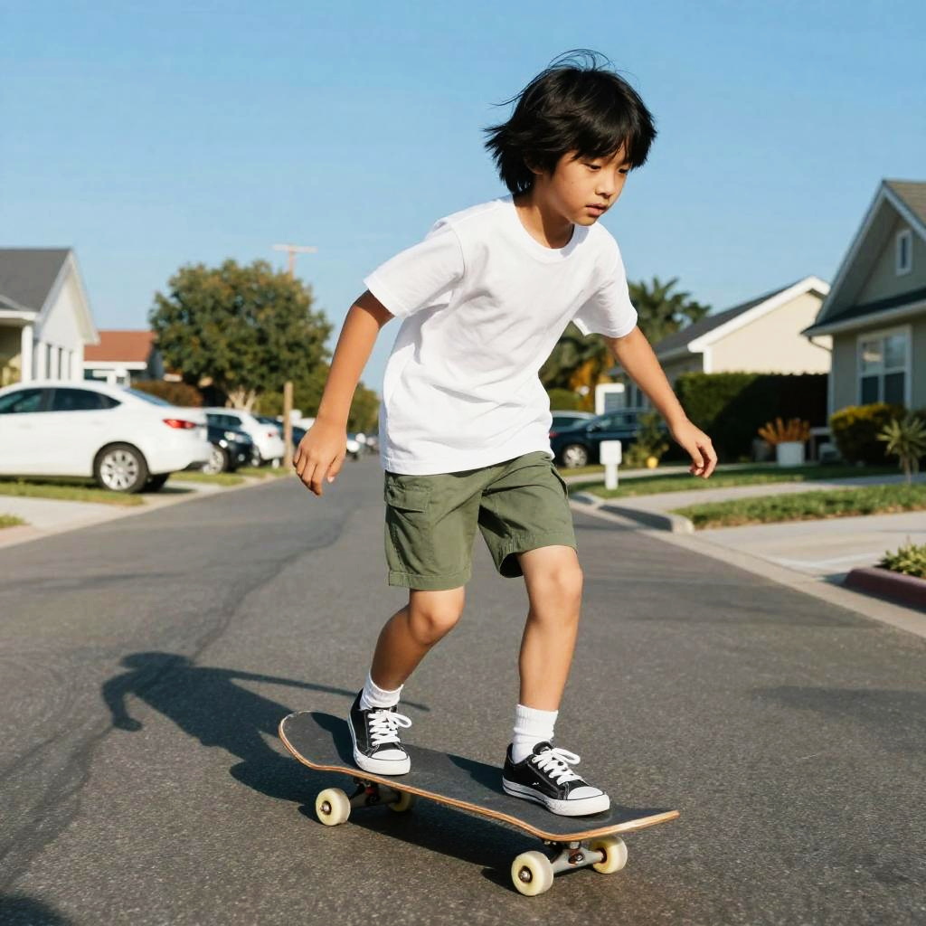 A photograph of a young Asian boy with shoulder-length black hair riding a skateboard down a quiet suburban street. He's wearing a white T-shirt, olive green shorts, white socks, and black and white sneakers. The sky is blue, and there are parked cars and houses in the background. He's in mid-motion, looking focused and determined. The street is dark, contrasting with his bright outfit.