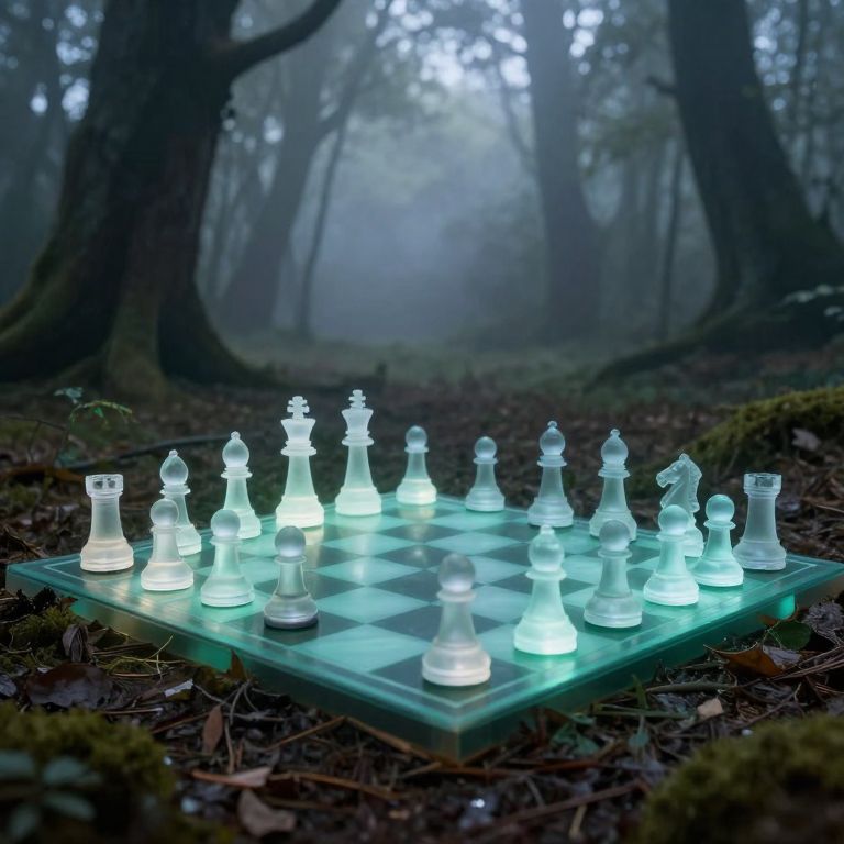 A luminous chessboard glows ethereally amidst a misty forest, its translucent pieces casting ghostly reflections on the dappled ground, as if conjured from the dreams of the ancient trees.